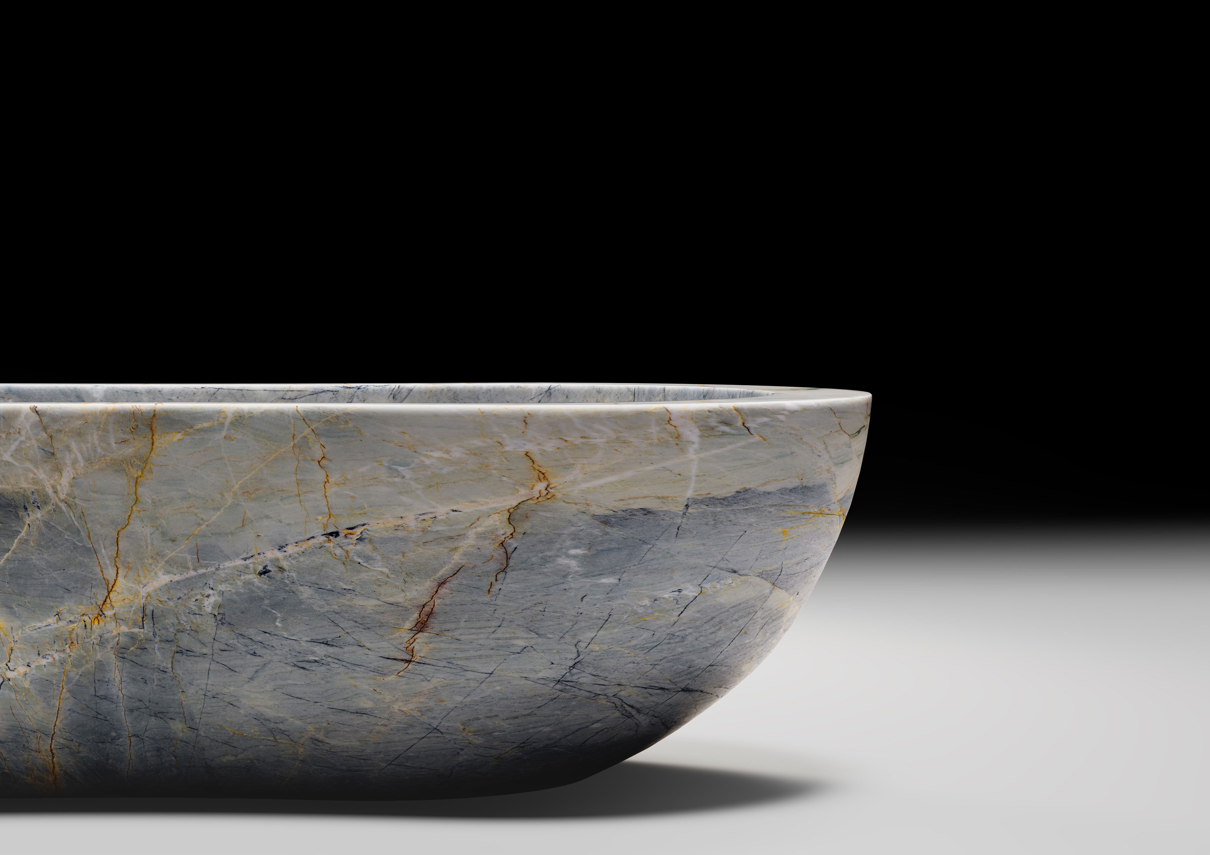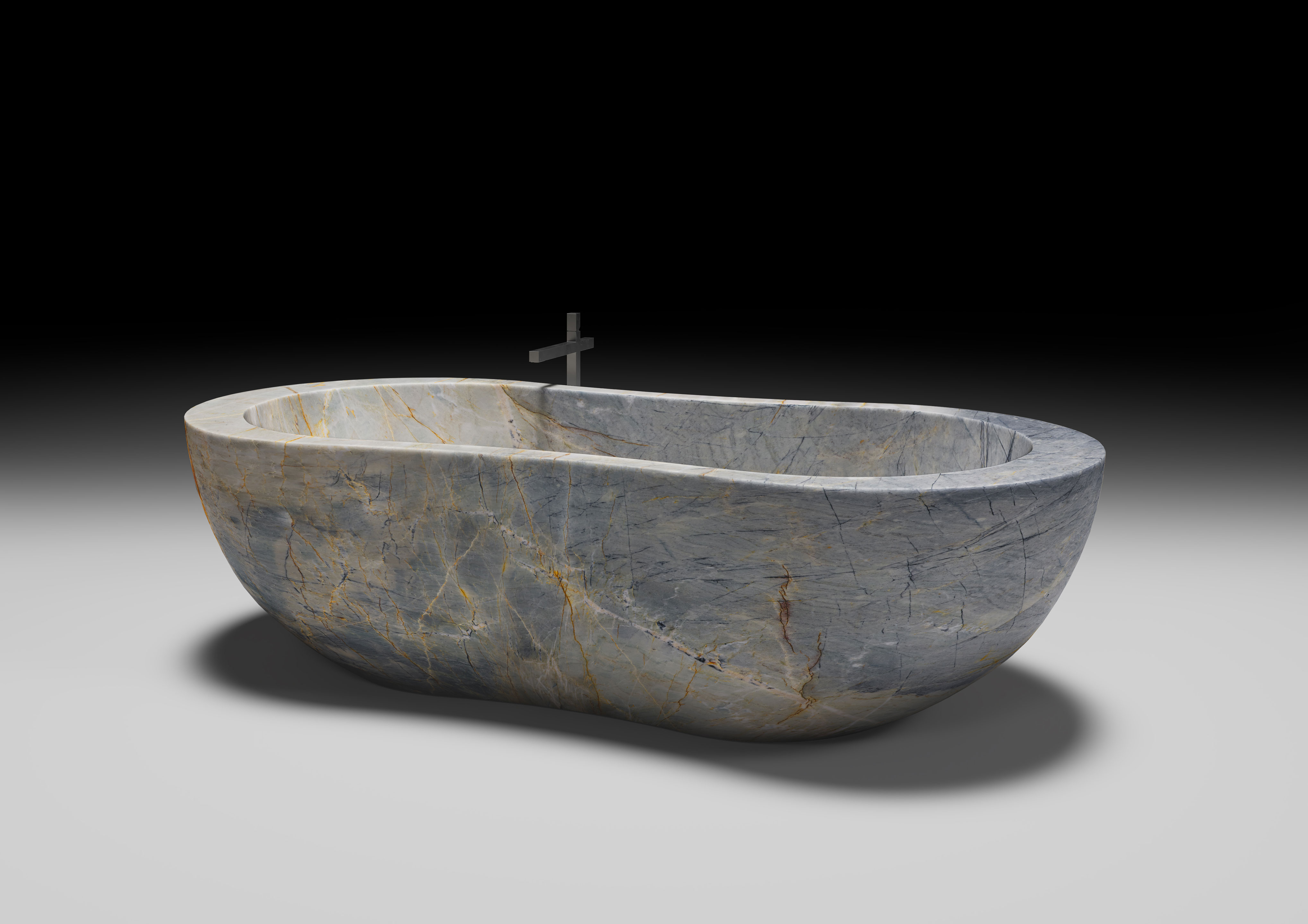 Designed by the duo Nespoli and Novara, it possesses a substantial presence paired with a graceful, sinuous profile—shaped by a flowing curvilinear rhythm that imparts remarkable dynamism to the bathtub. Through this synthesis, Convivium speaks the language of contemporary design. Yet, it is the material itself that tells an older tale—the timeless nature of marble, eternal and crafted to endure