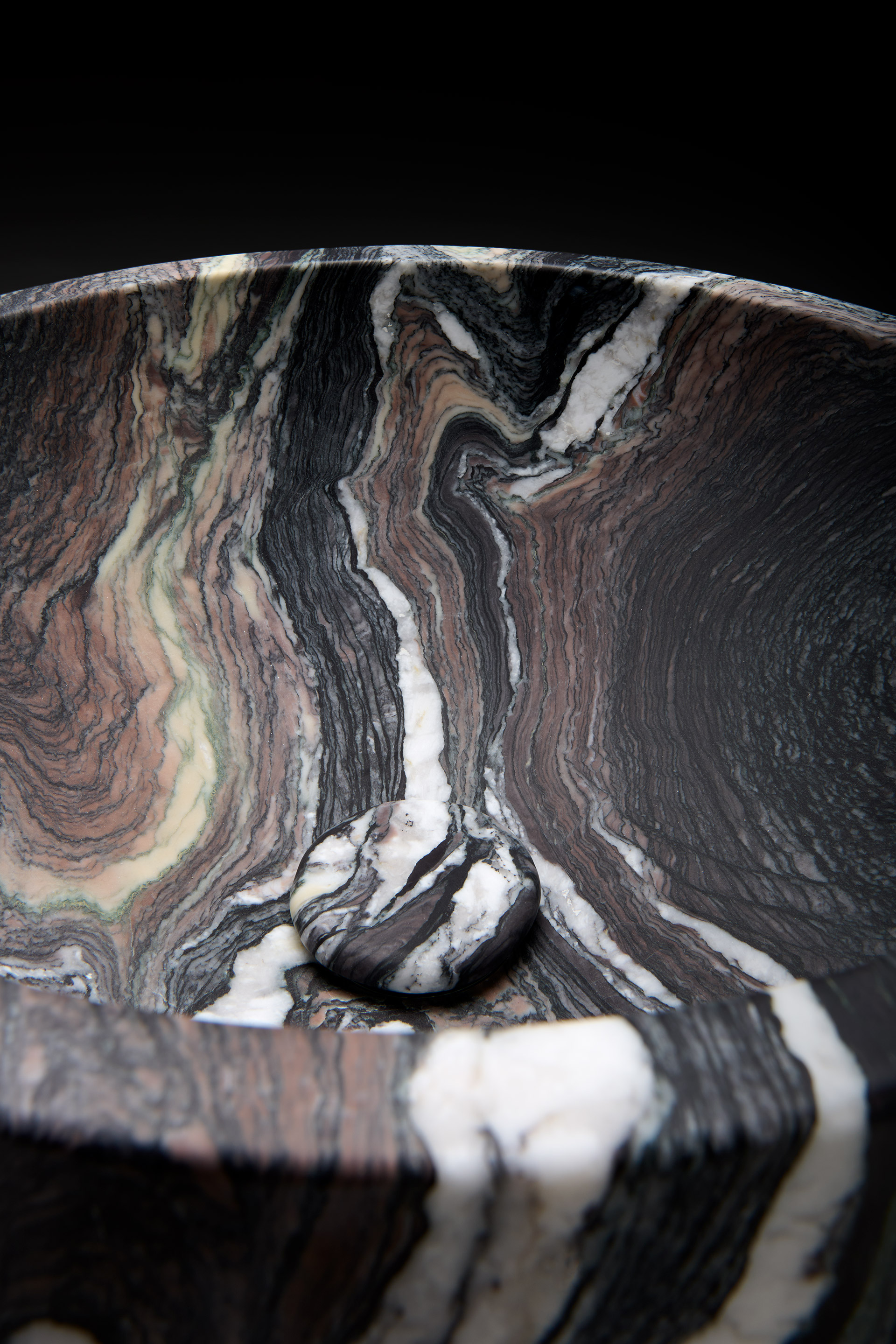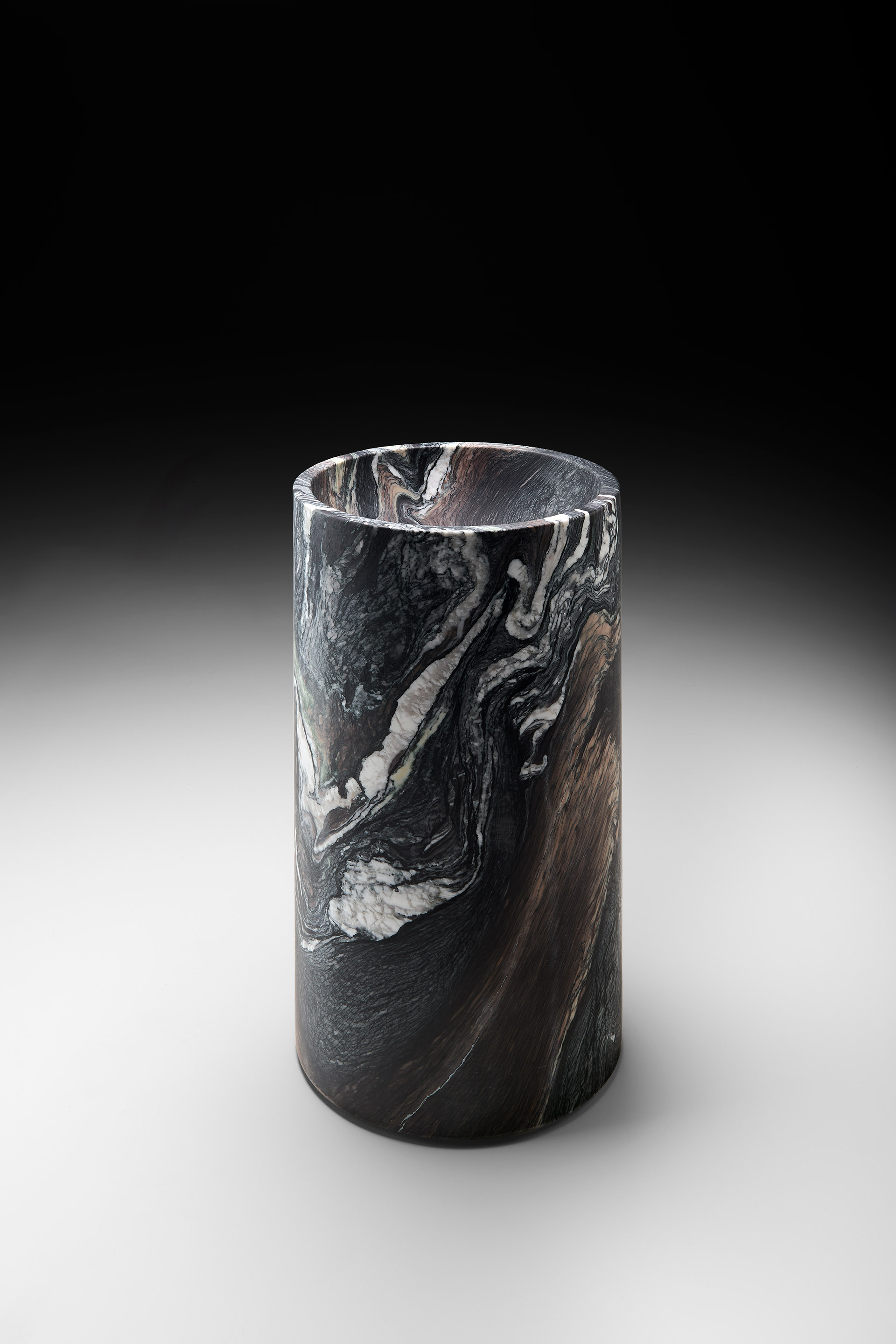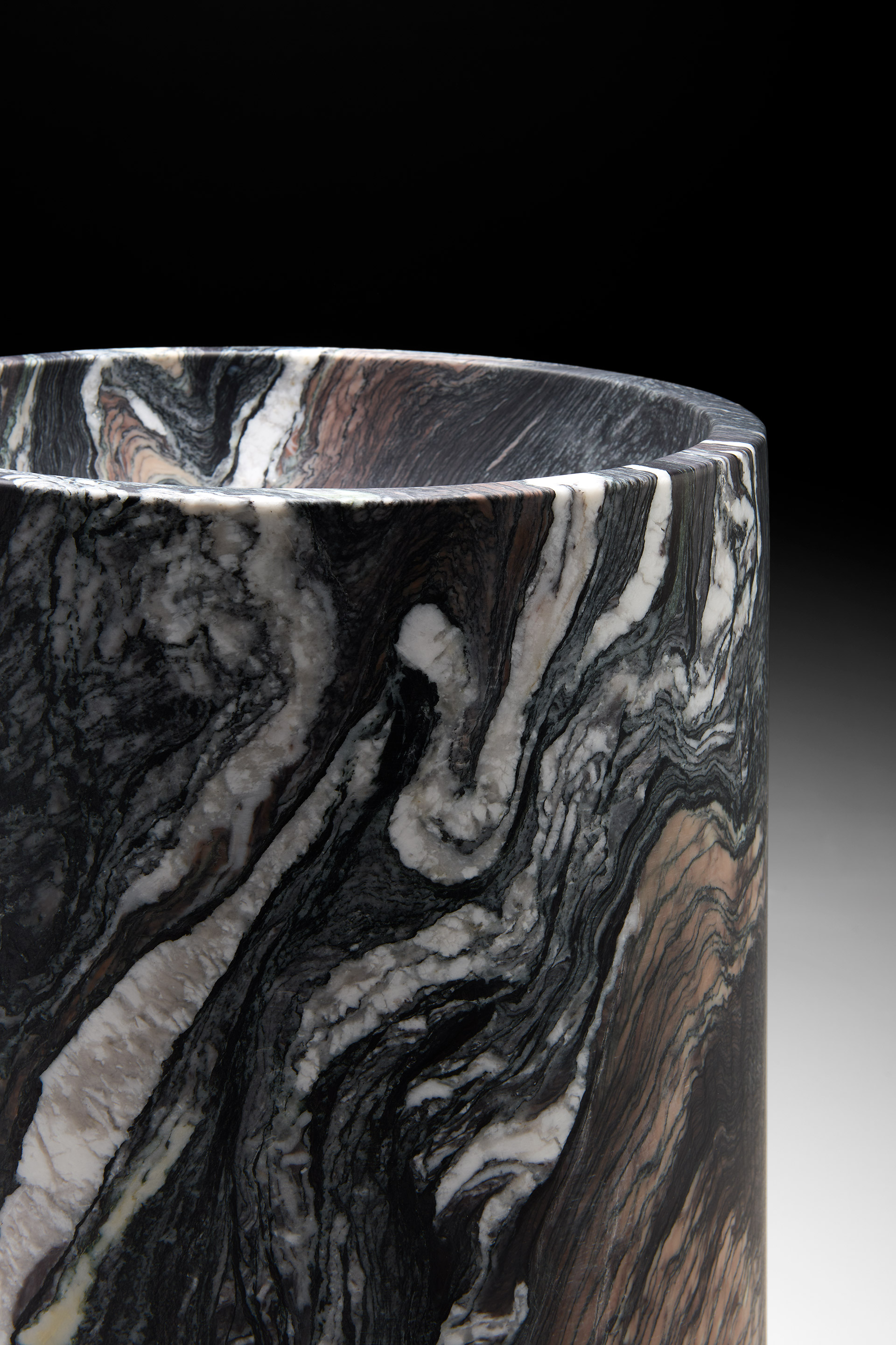 A vortex of tonal nuances, a flow of freeform veining that dances across the stone like waves on a mirrored surface. The version of the Minimal washbasin celebrates the purity of the cylindrical form, allowing the material itself to take center stage with strong artistic expression.
