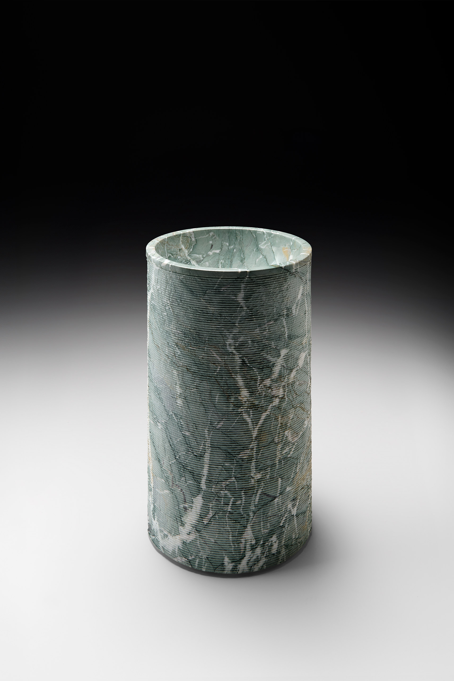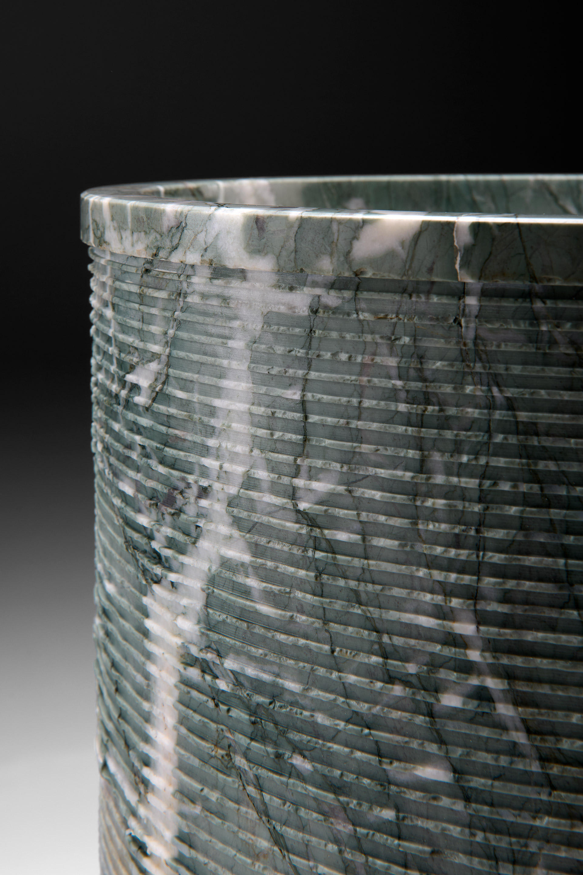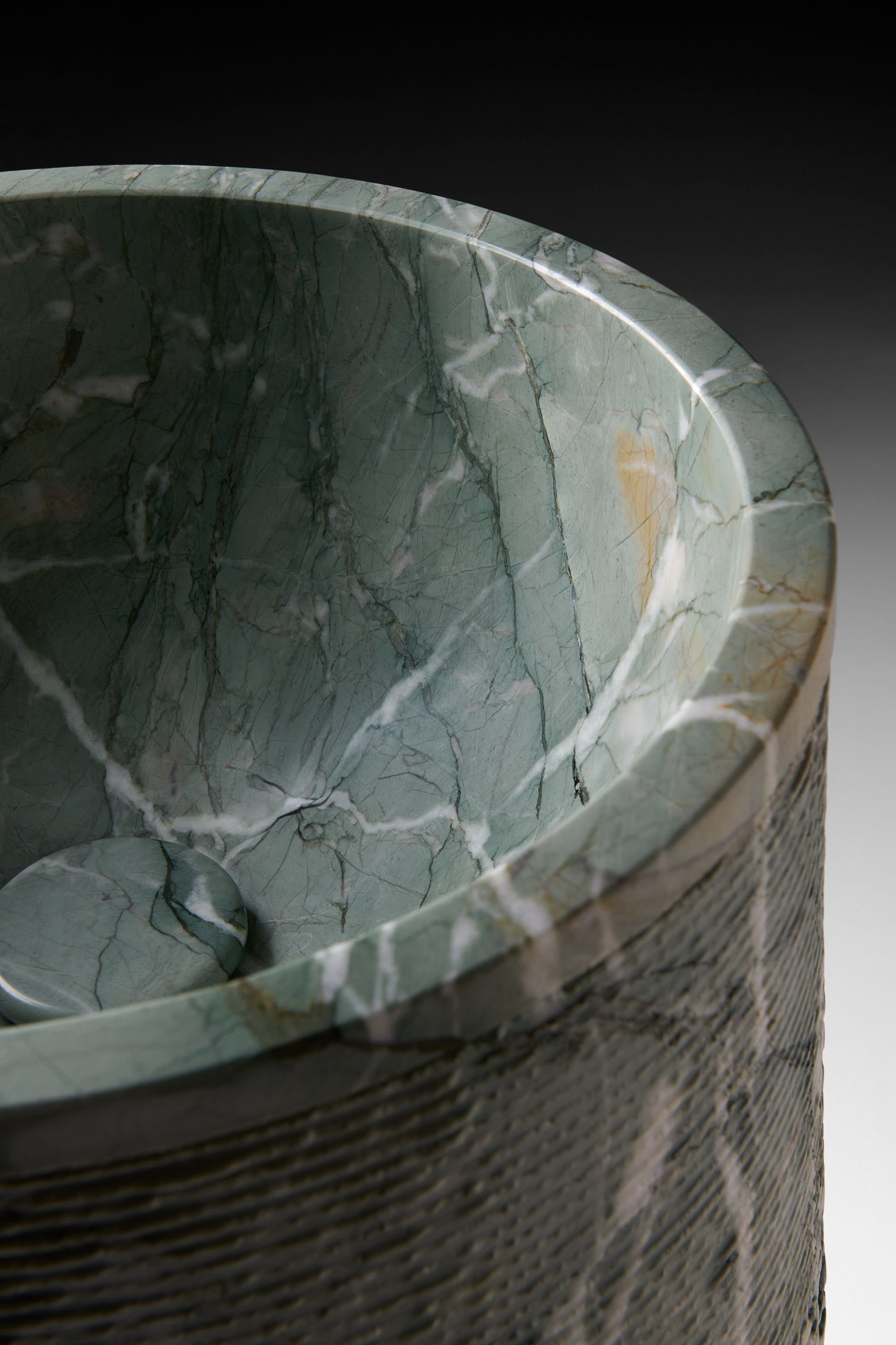 The first interpretation is defined by the bold Random split-face finish, which wraps the cylindrical volume in a rhythmic engraving carved into stone. Fine horizontal grooves trace the surface, creating a tactile, three-dimensional texture that catches and refracts light. The result is a harmonious, deliberate sequence—imbued with balance, precision, and architectural clarity. In this dialogue between craftsmanship and raw material, the stone asserts its most expressive nature: veins and tonal nuances emerge with striking clarity, shaped by the interplay of depth, relief, and chiaroscuro.