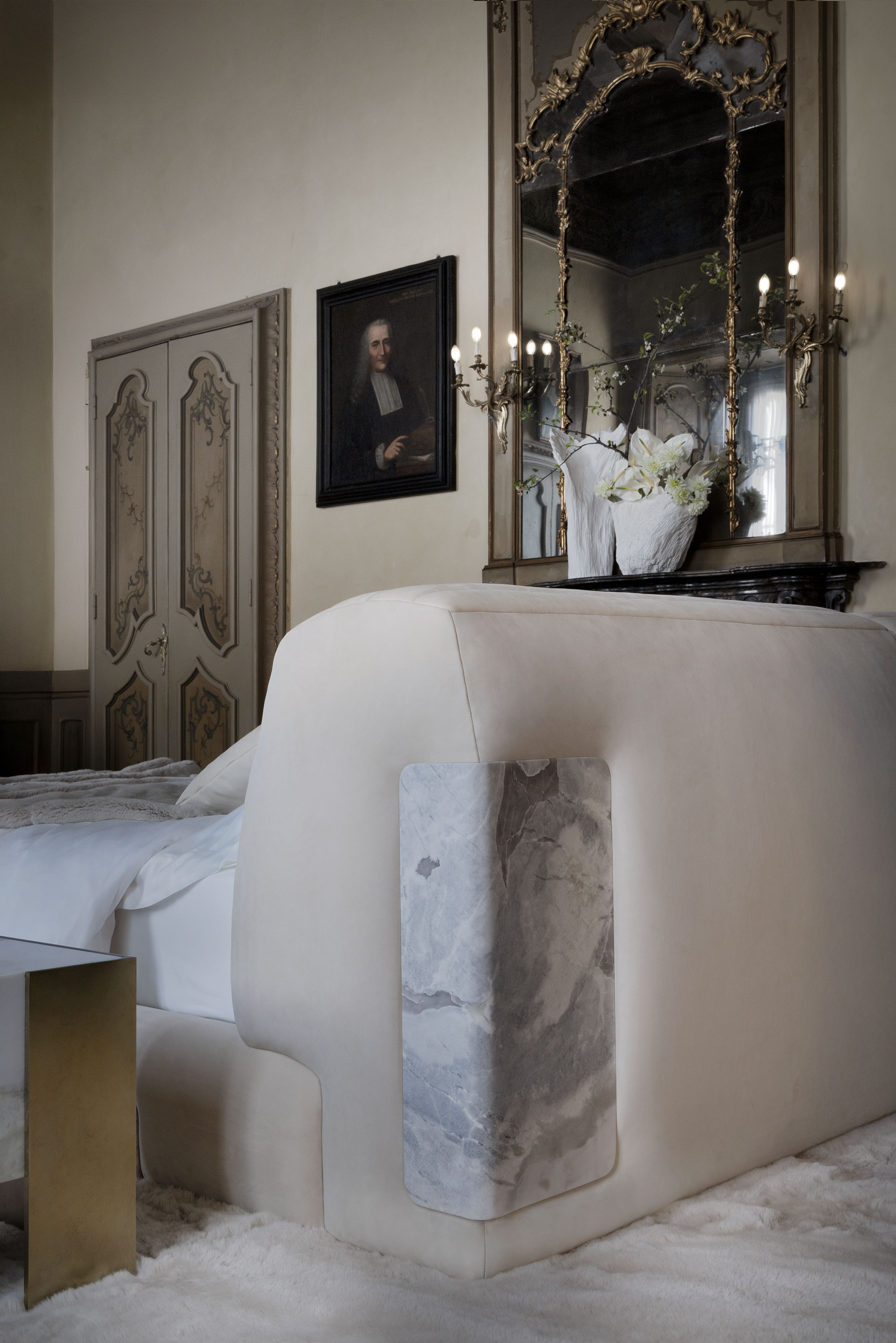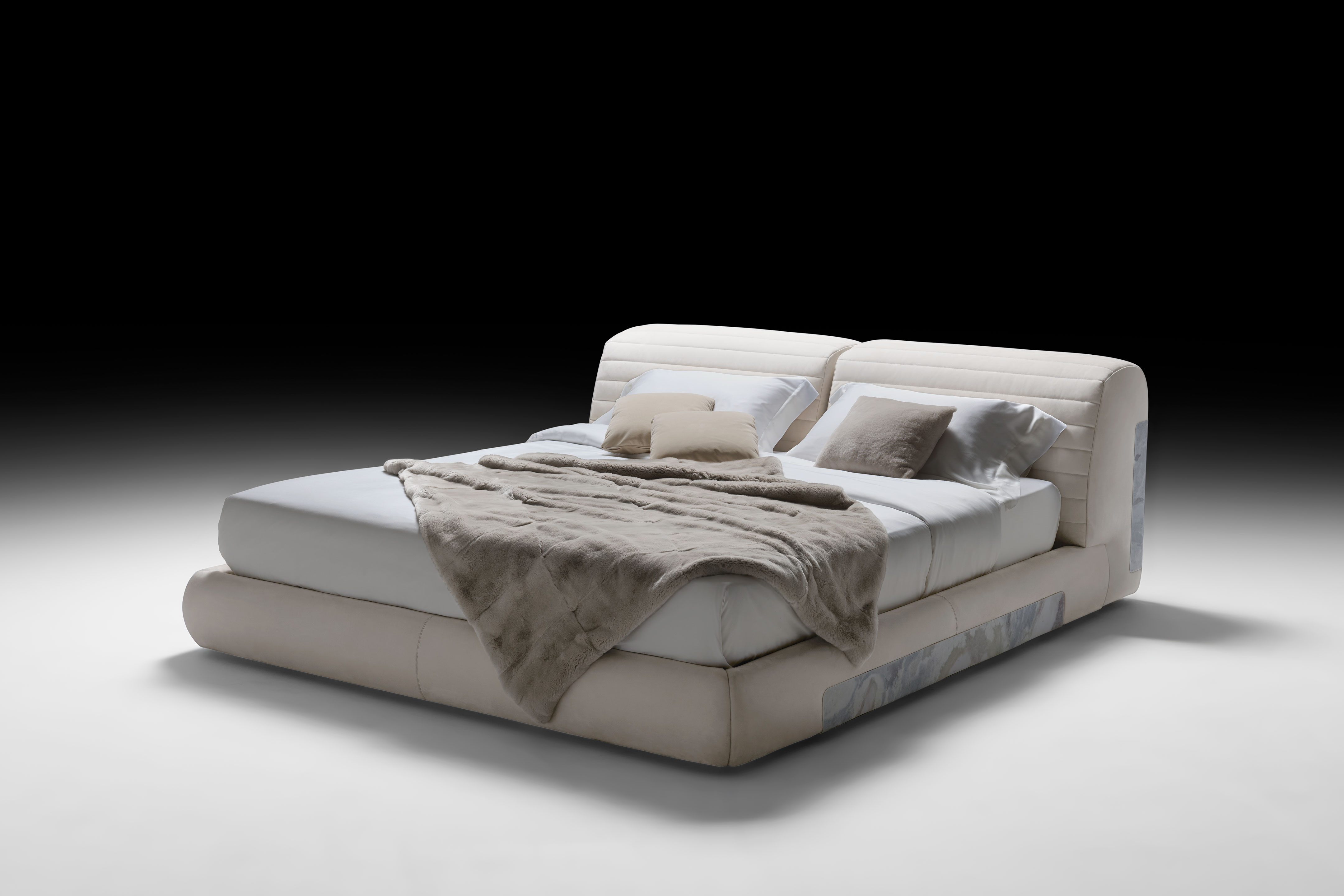 The Moon bed lives in this harmonious duality where the softness of the volumes blends in with the strength of marble. Deep and soft, the headboard envelops whoever leans against it in an intimate embrace.