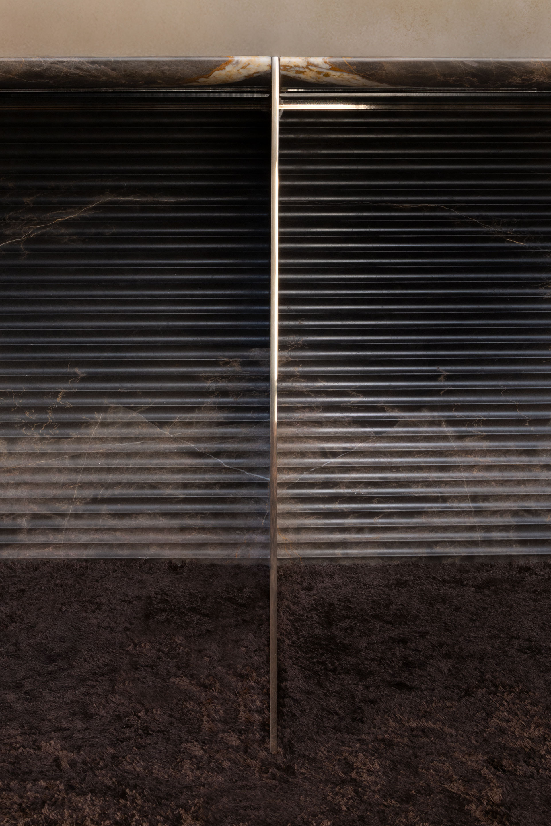 This theatrical device enhances the precious effect of the four marble slabs, enriched with deeper grooves at the center that gradually fade toward the edges. A refined detail that reveals the authenticity of solid marble and makes it vibrate when struck by light.