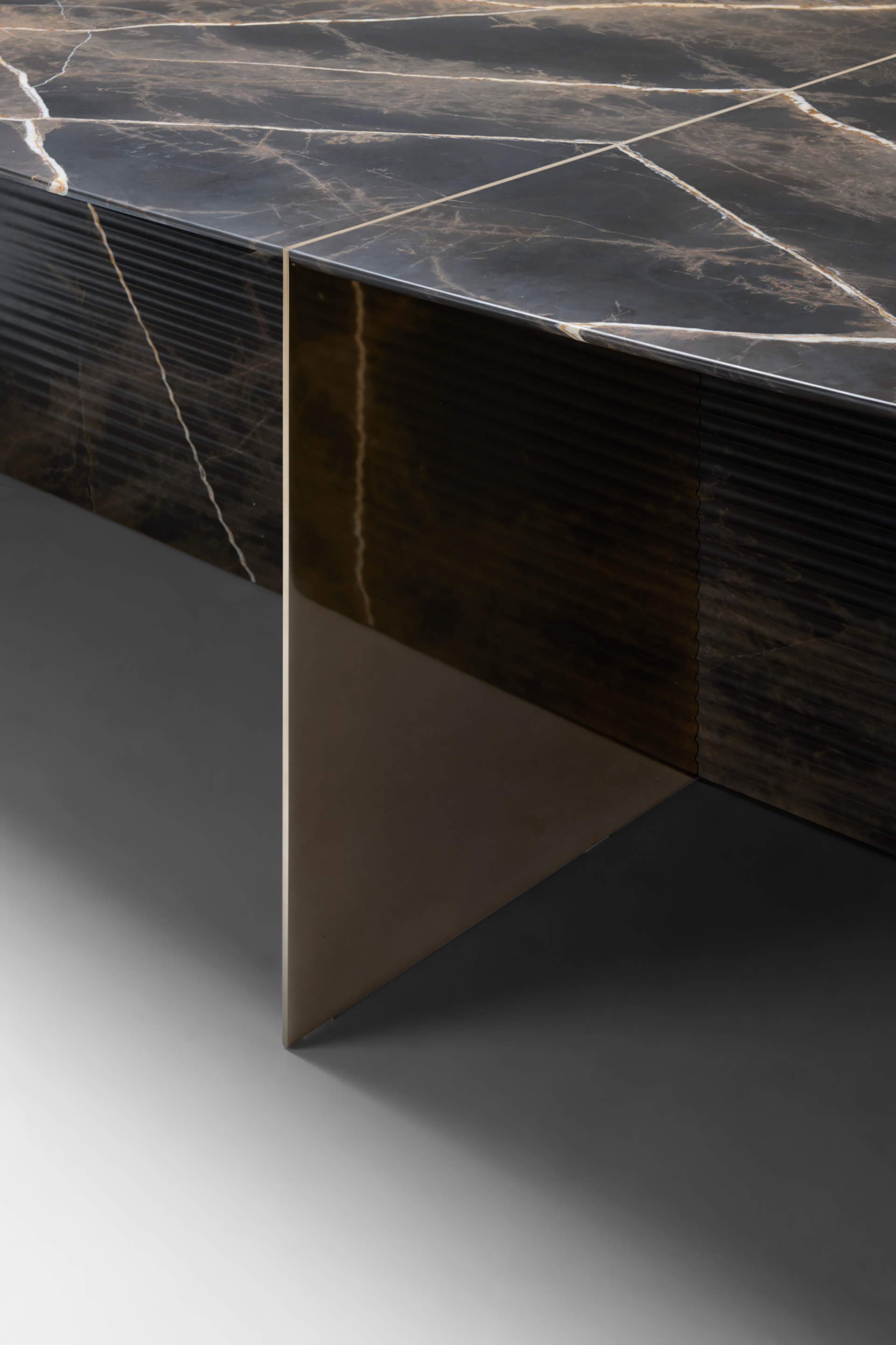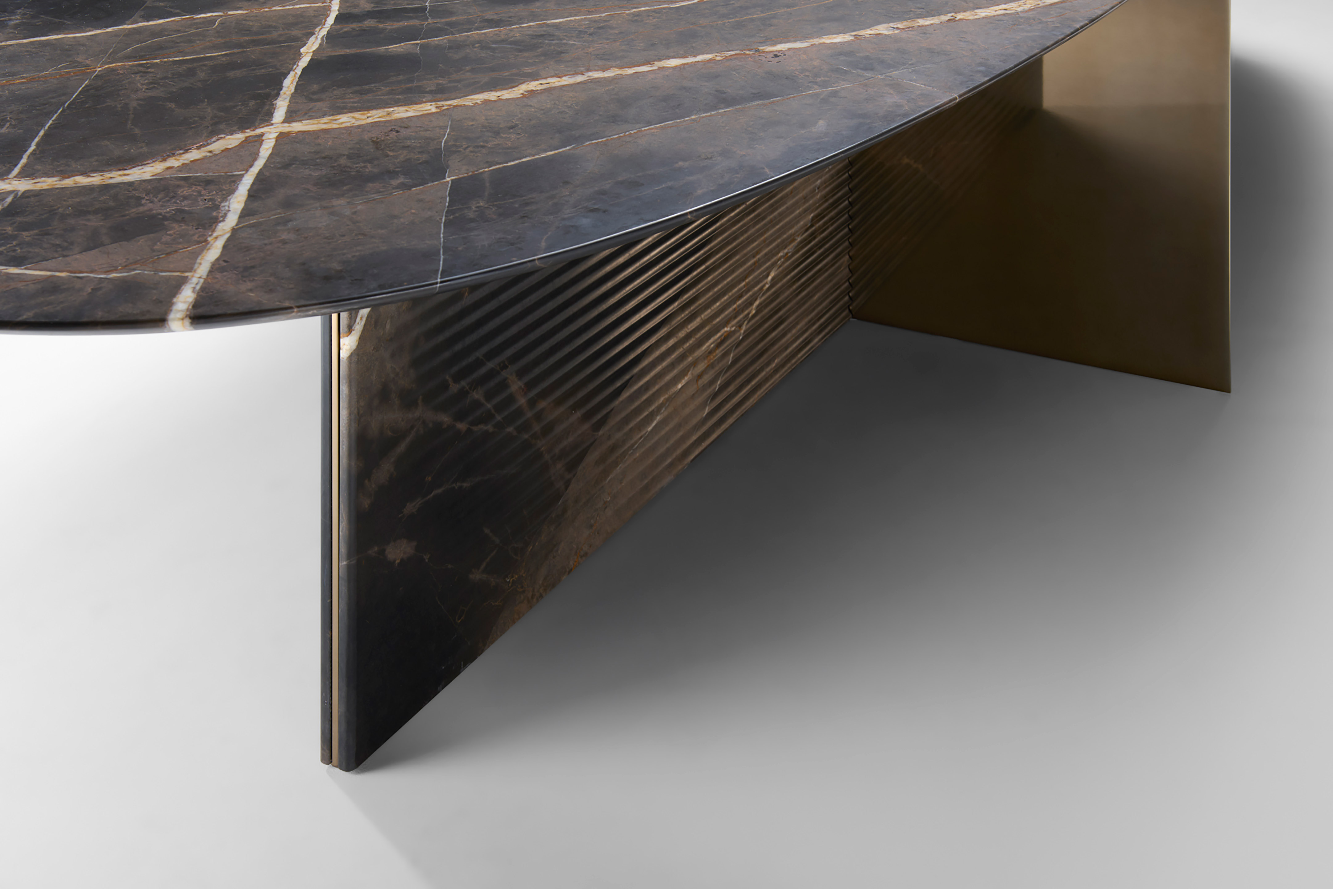 The form yields to the marble, allowing the material to take center stage. The elongated top, resembling two wings brushing against each other, symmetrical and suspended, appears to float, precisely balancing the weight of the volume. At its center, a thin sheet of finely crafted metal cuts through the top like a shadow line, dividing it into two mirrored semi-ellipses. Everything is balance, rhythm, and proportion.