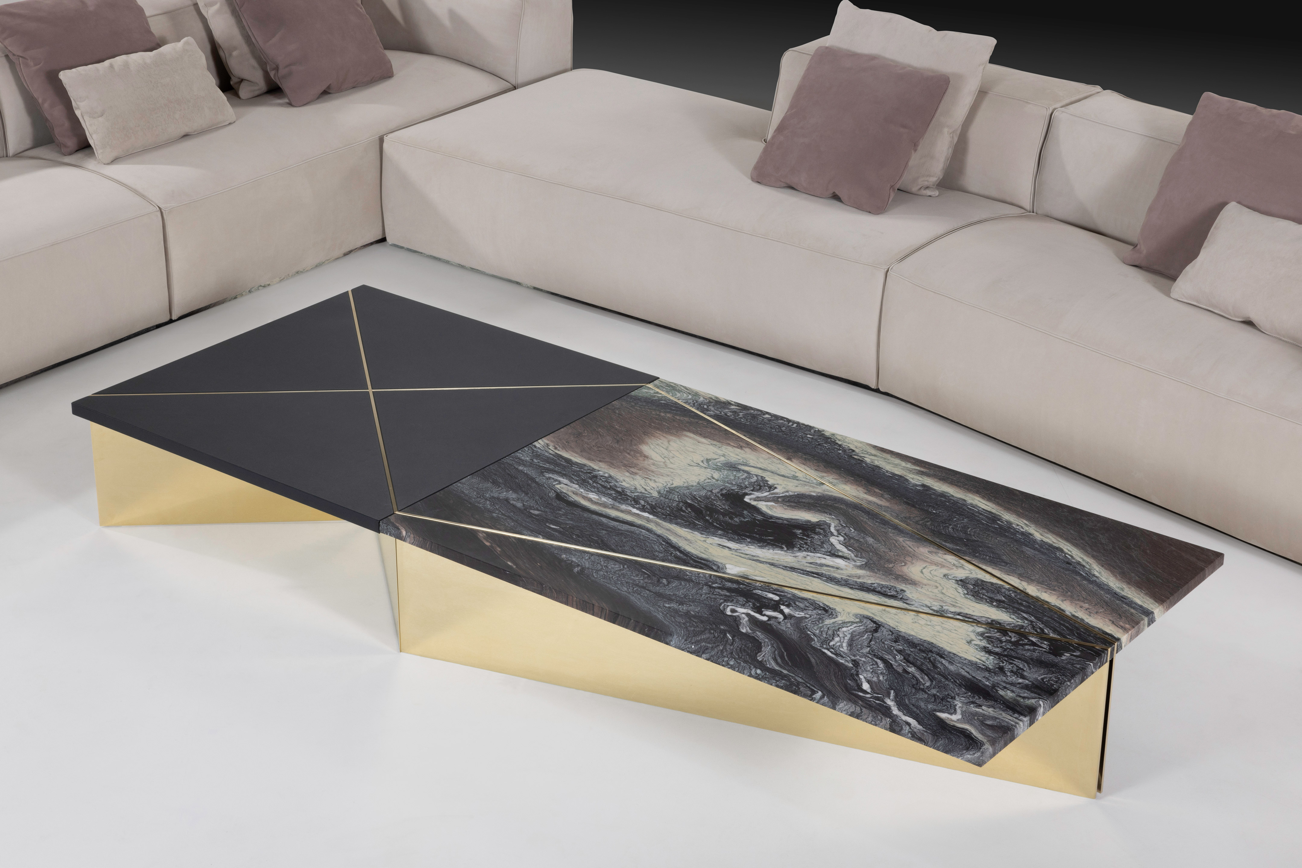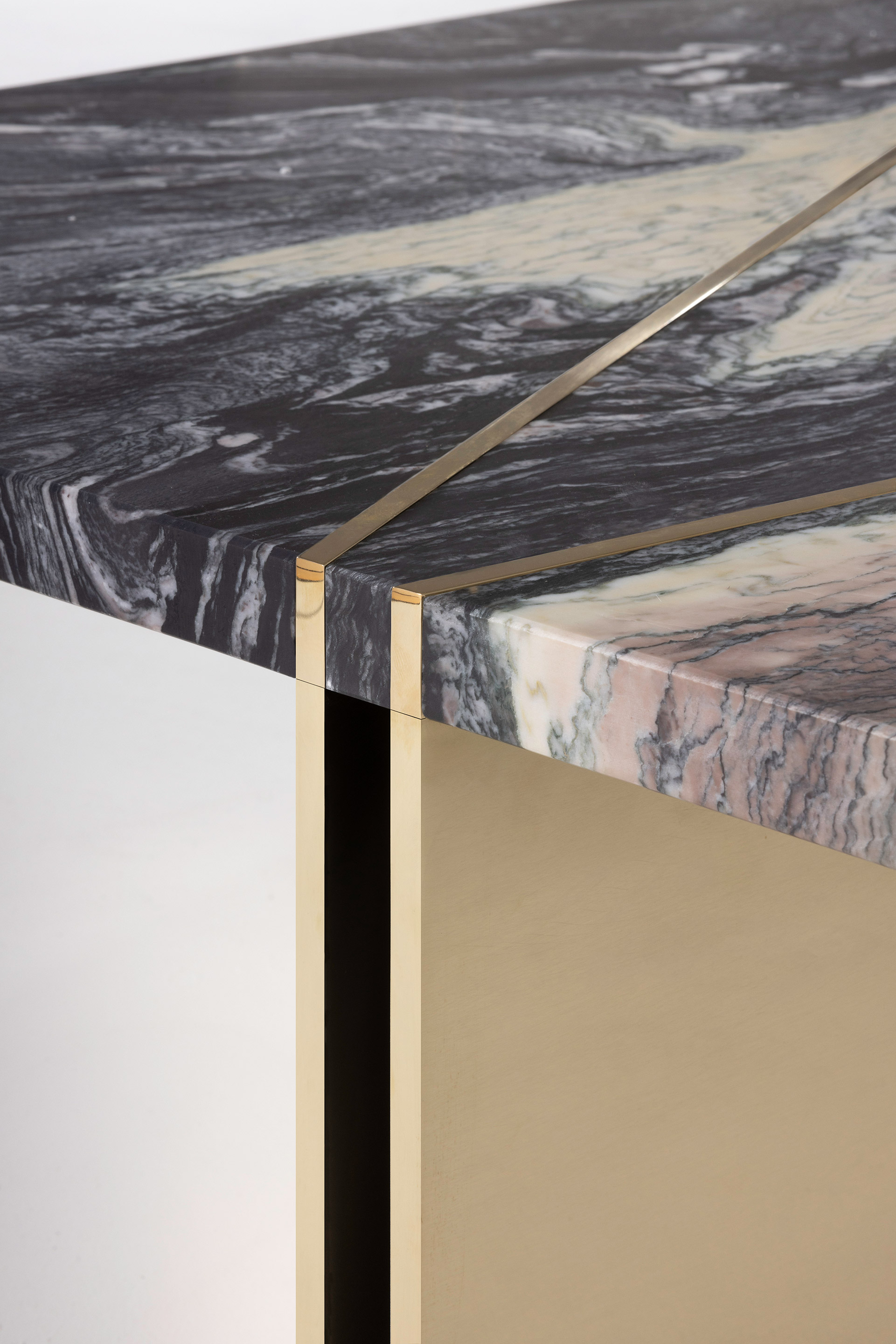 Traces and markings form the very structure of the tables, crafted from finely worked precious metal plates that rise from the base and seamlessly merge with the marble top. This sophisticated convergence of pure geometric forms—an interplay of solids and voids—gives rise to ever more complex and hypnotic compositions.