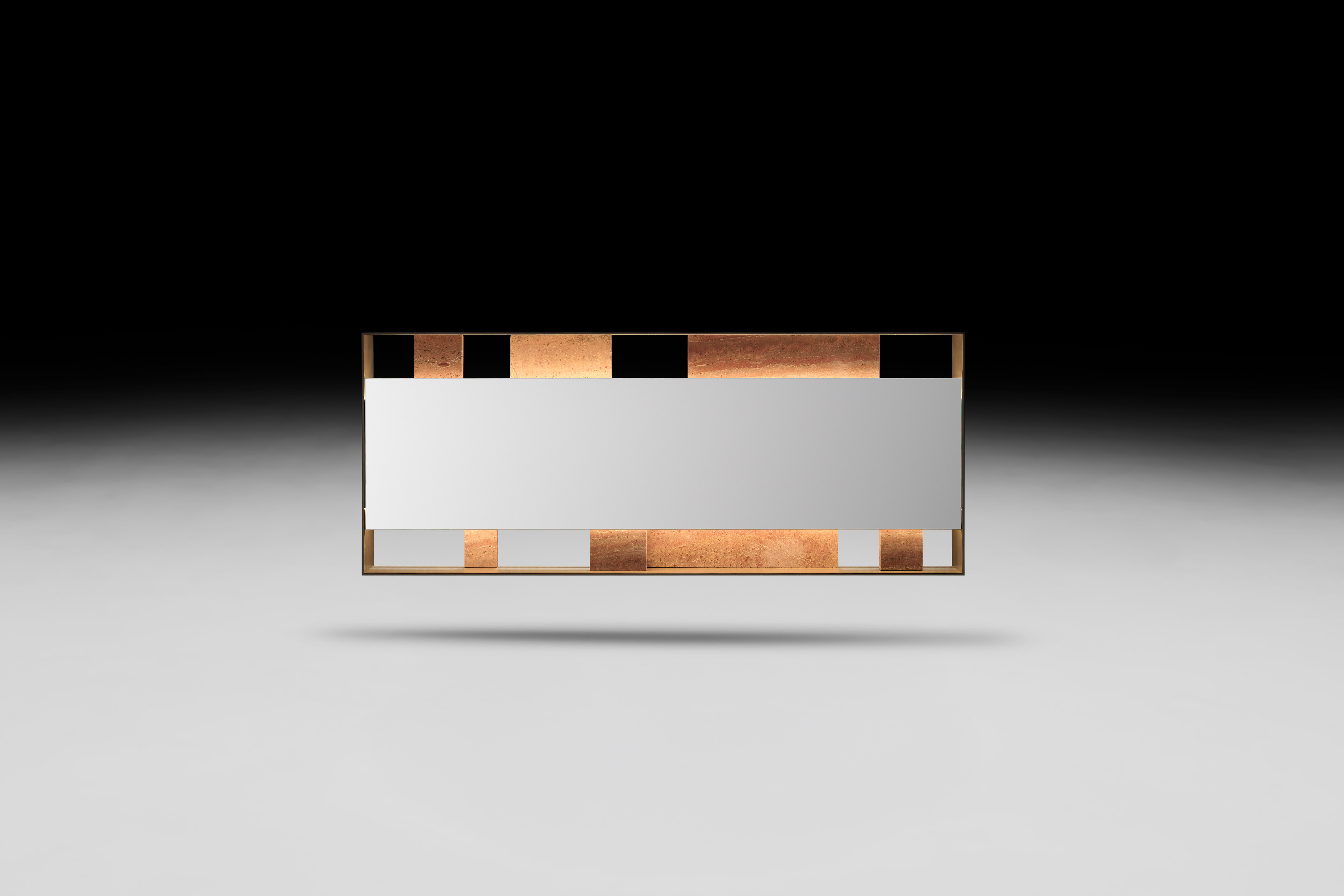 The structure unfolds across multiple visual and tactile planes. Set within a lightweight, architectural aluminum frame are reclaimed marble inlays—each unique in quantity, cut, and scale. This variation produces a continually evolving composition that resonates under grazing light. It is this light that sculpts the volumes and magnifies the piece’s three-dimensional presence.