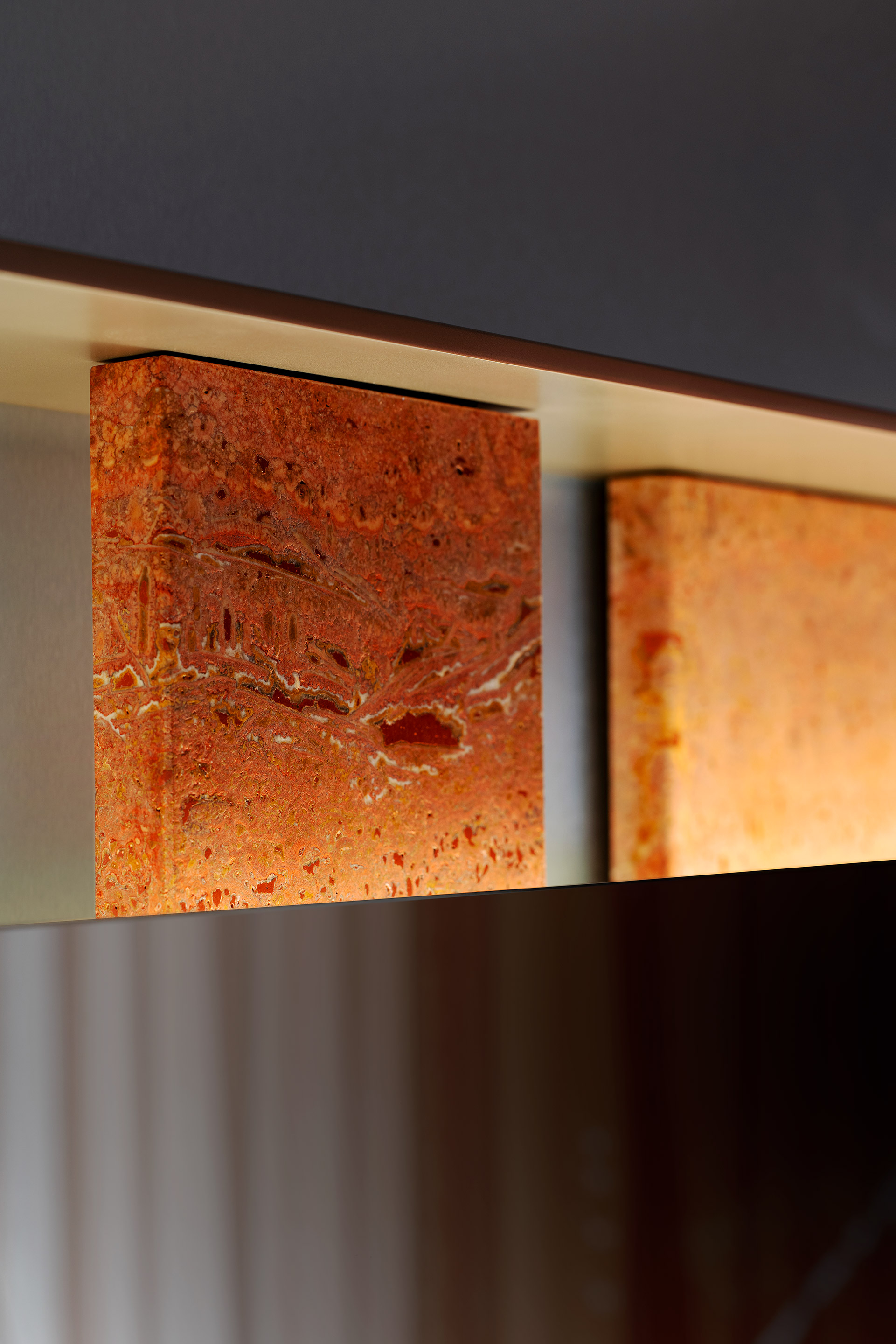 Dima commands attention at first glance through its architectural rigor, geometric clarity, rich materiality, and the luminous depth that courses through it. It is an object where precision meets emotion, shaping space with the pure essentiality of its form: a rectangular sculpture that thoughtfully balances solids and voids, surfaces and recesses.