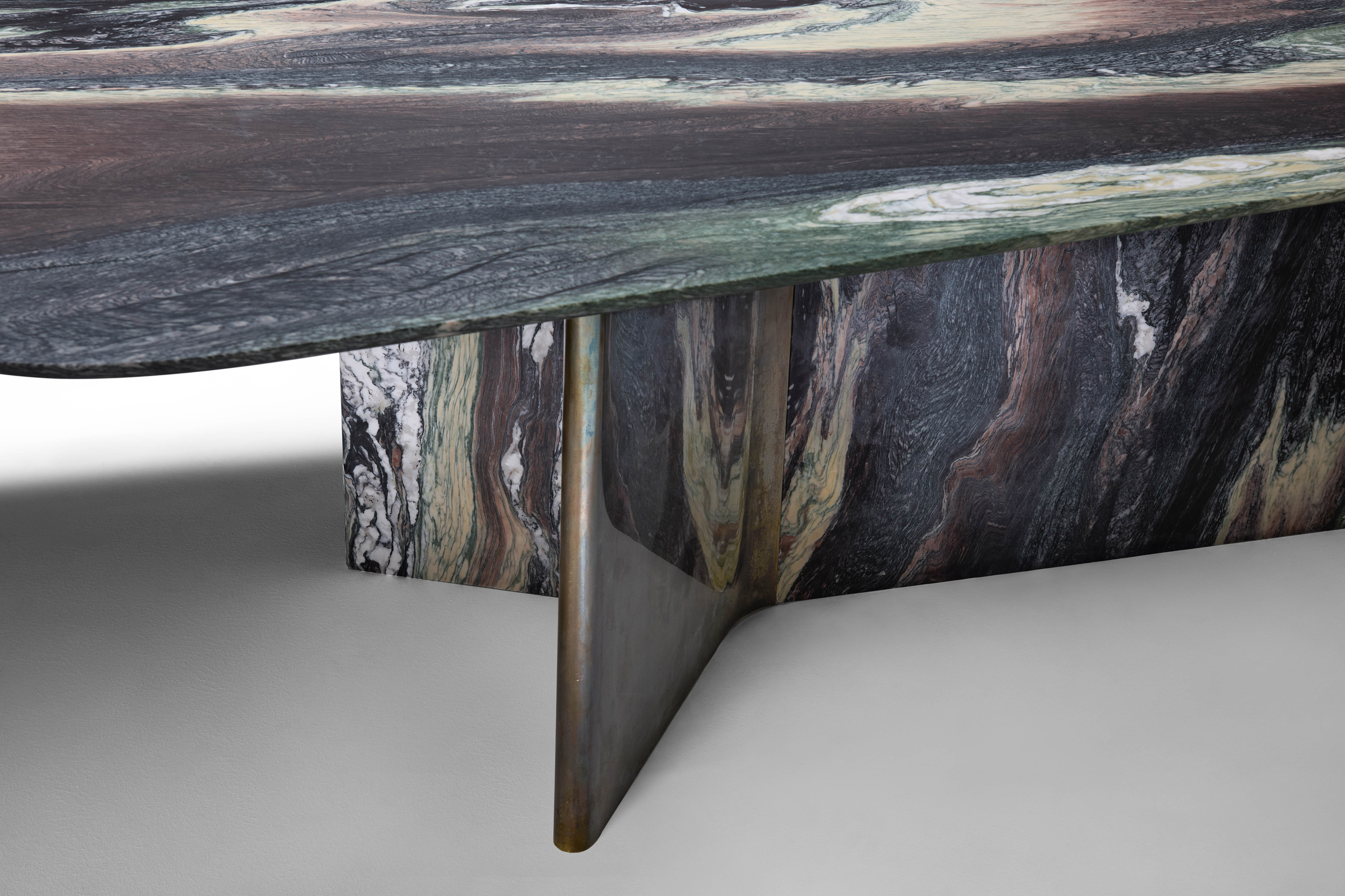 Islas Table in mixed Cipollino marble paired with a burnished brass