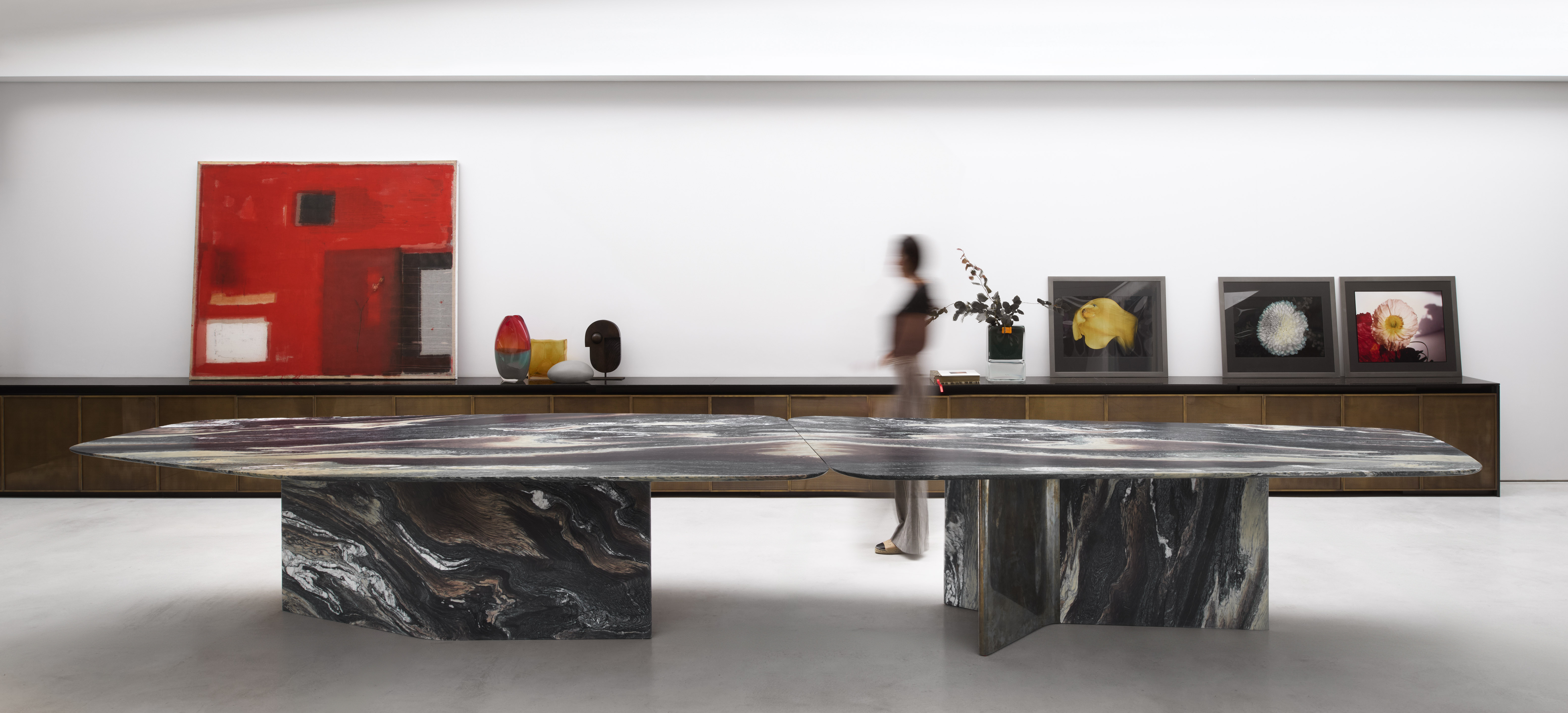 The Islas table is the result of a deep exploration — a meditation on form, material, and function that culminates in a richly layered visual and tactile experience. It is a celebration of contrasts: the strength and sensitivity of stone, the cool precision of metal, the dialogue between permanence and transformation.
