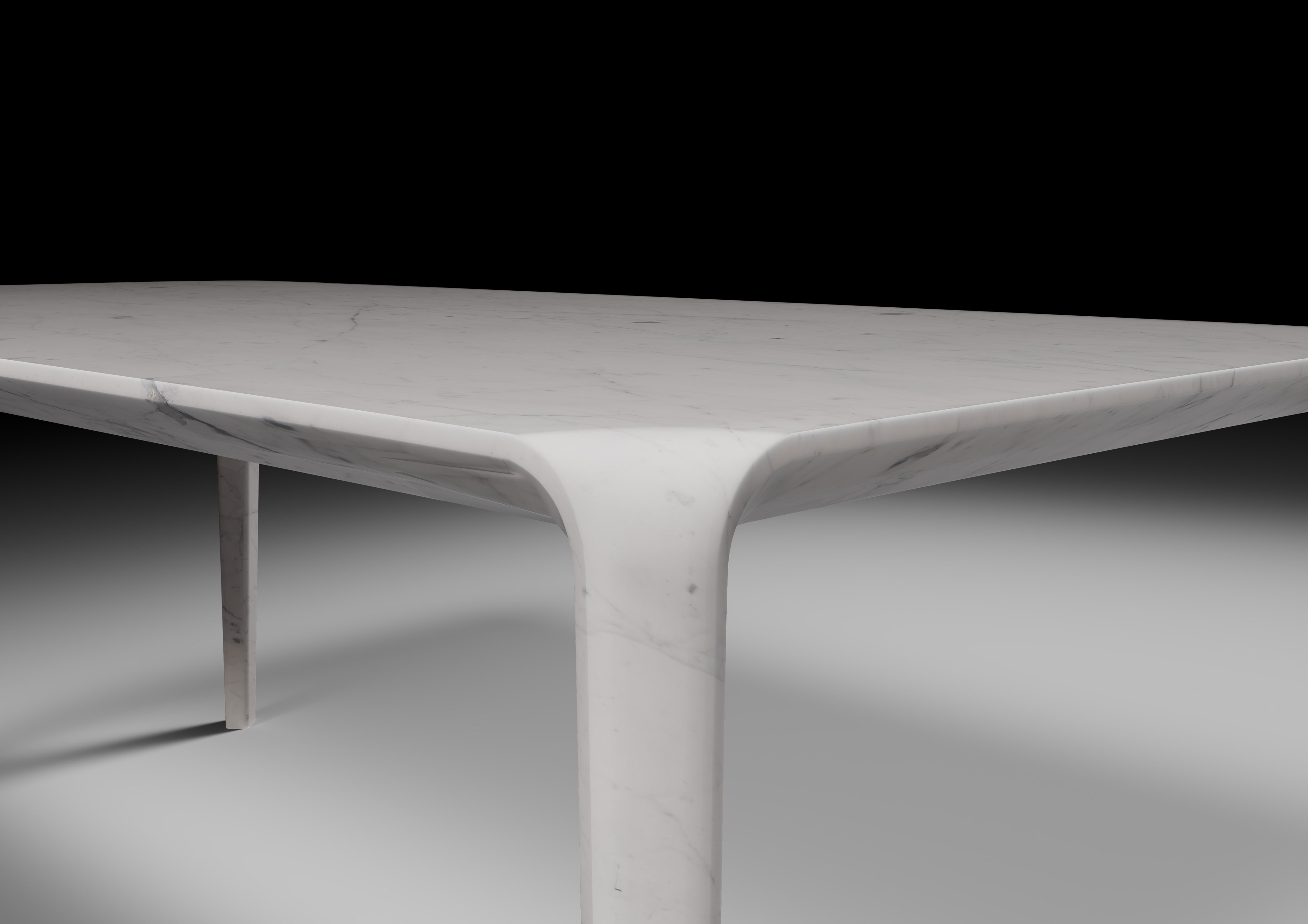 The expansive horizon of the tabletop meets the gentle slope of its edges — a subtle play of geometry and light that culminates in the curving softness of the corners. This harmonious contrast unfolds between the material’s inherent strength and its newly expressive lightness, giving rise to an object that stirs the senses as much as it furnishes the space.