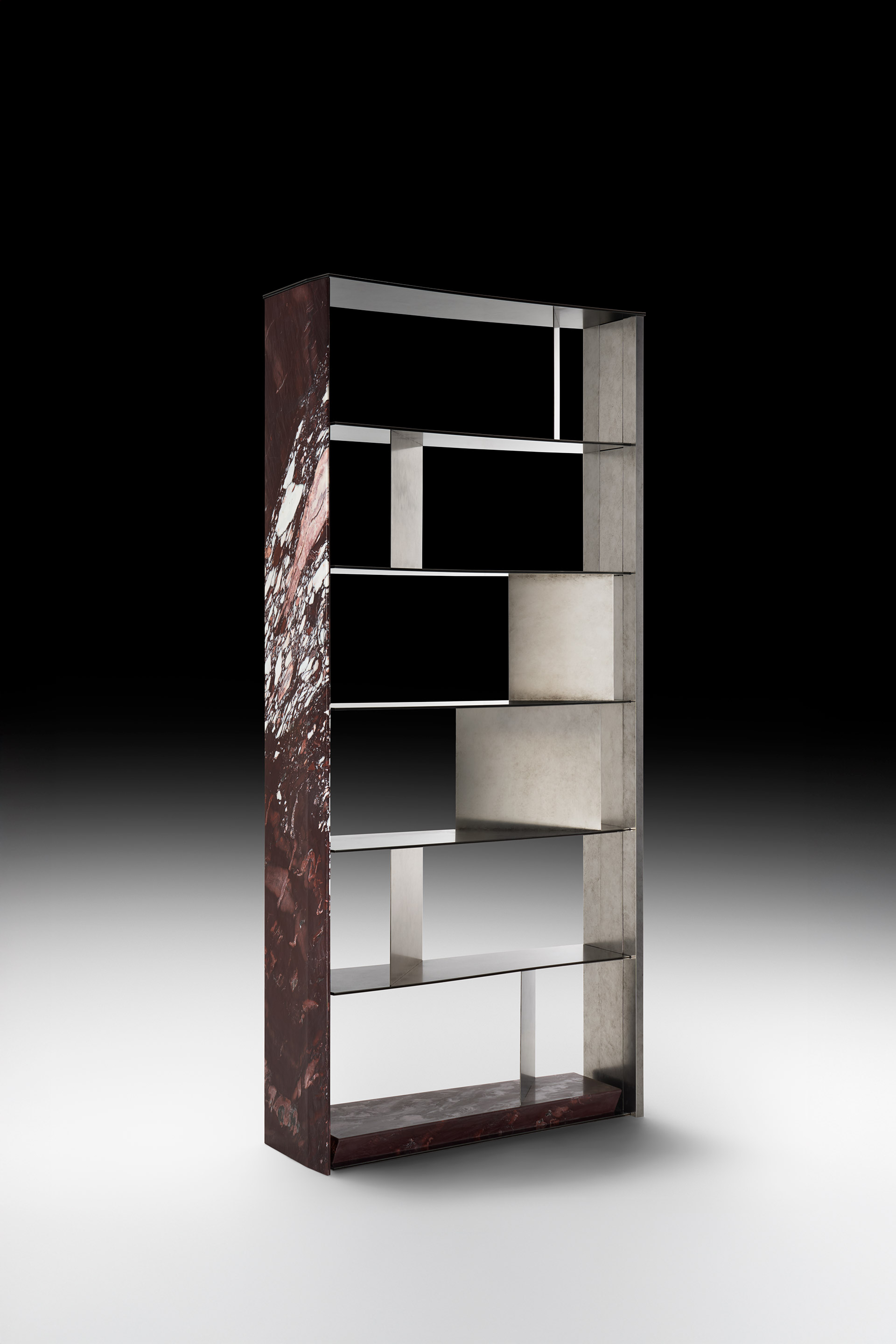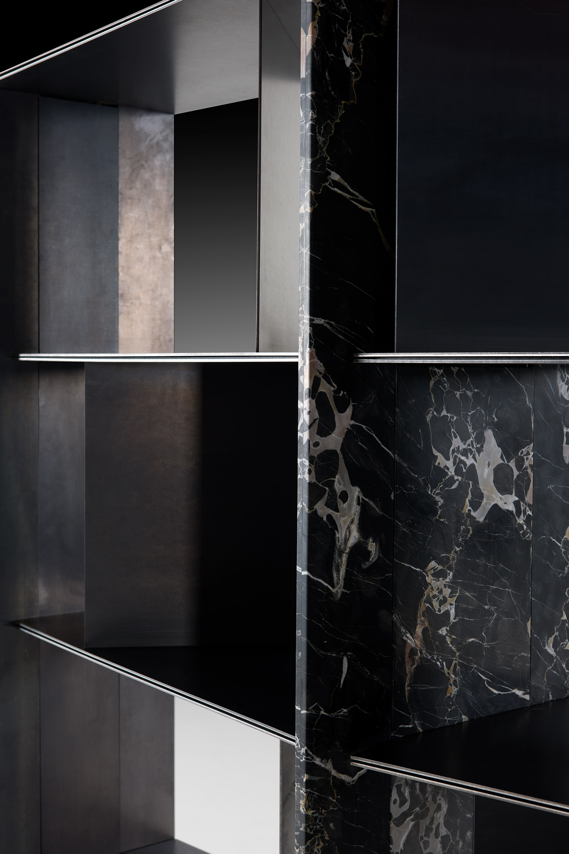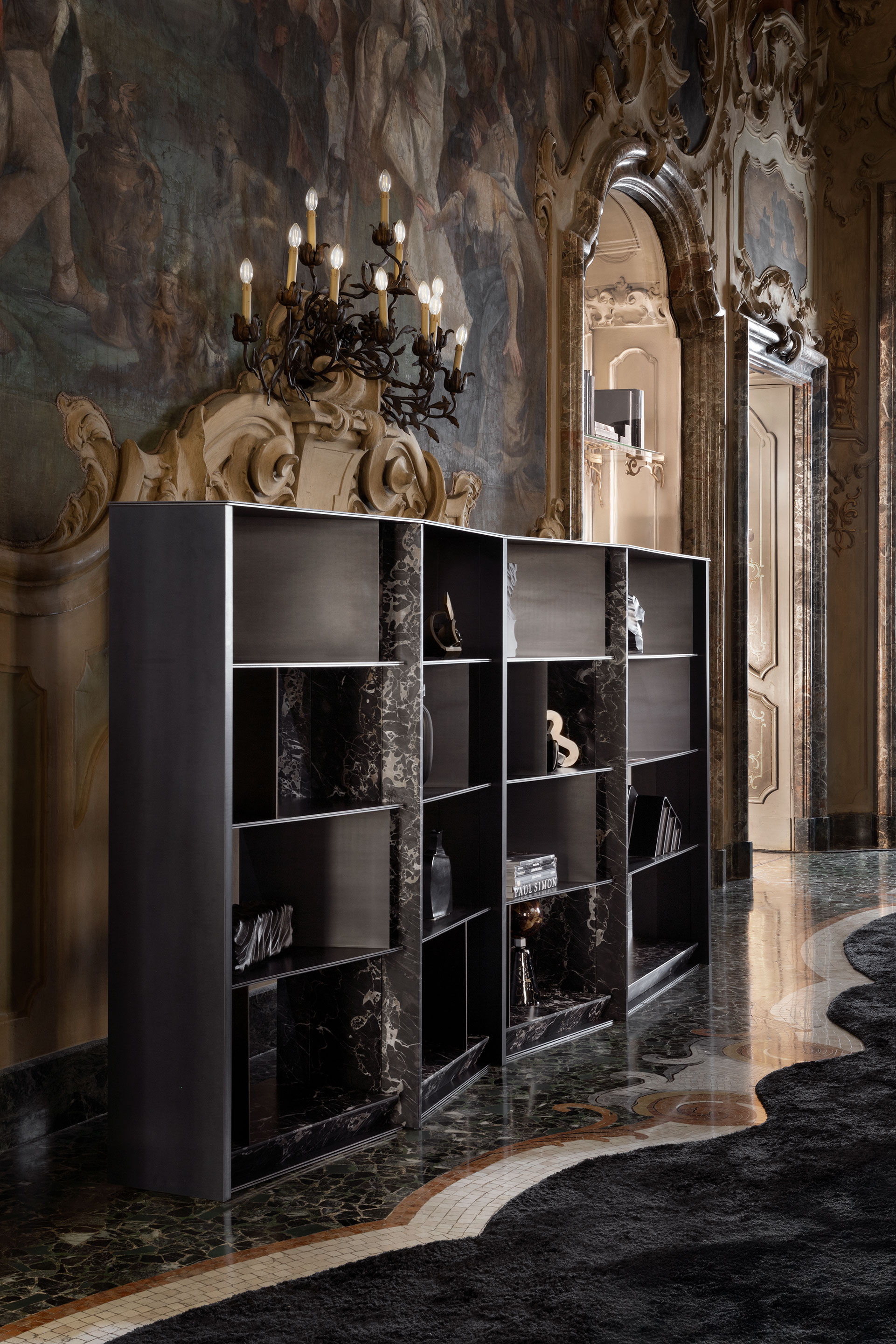The uprights alternate in a textural score: the gleaming coldness of metal embraces the vibrant veining of marble, while the shelves seem to float, suspended like pages turned by the wind. Each element is designed to welcome light, which slides, refracts, and plays with the surfaces, offering new chiaroscuro effects and suggestions.