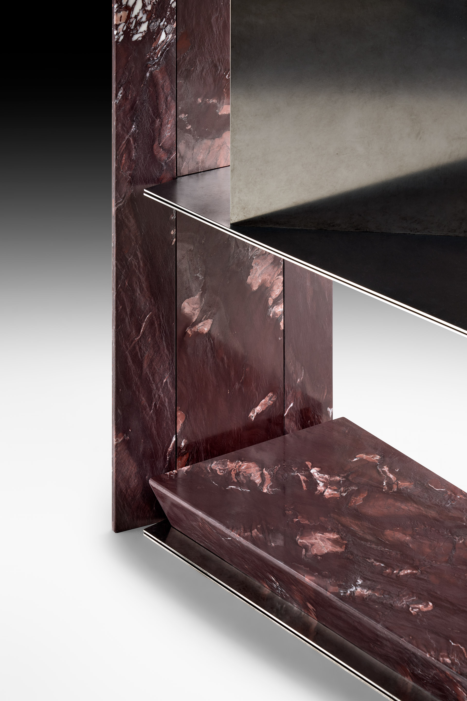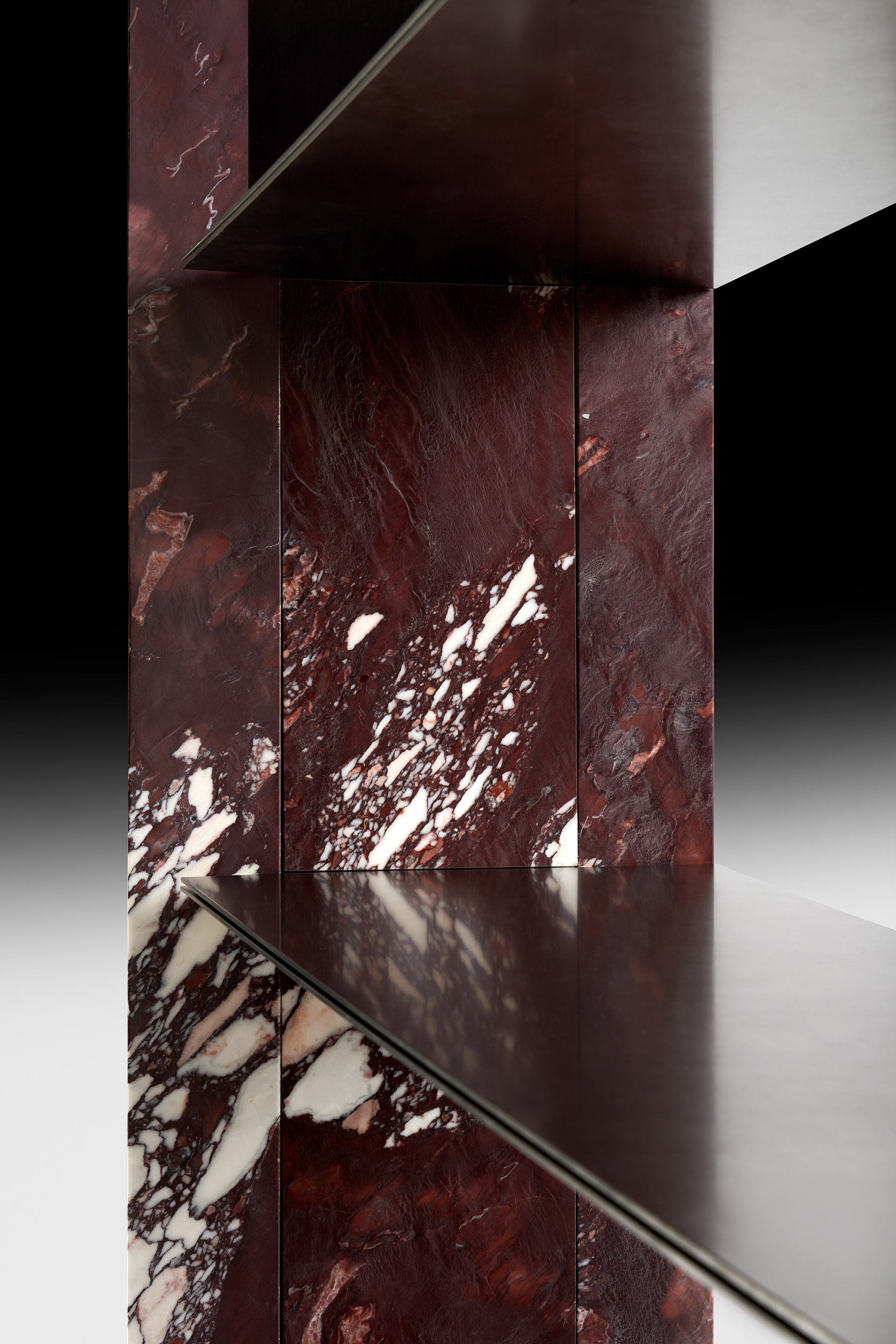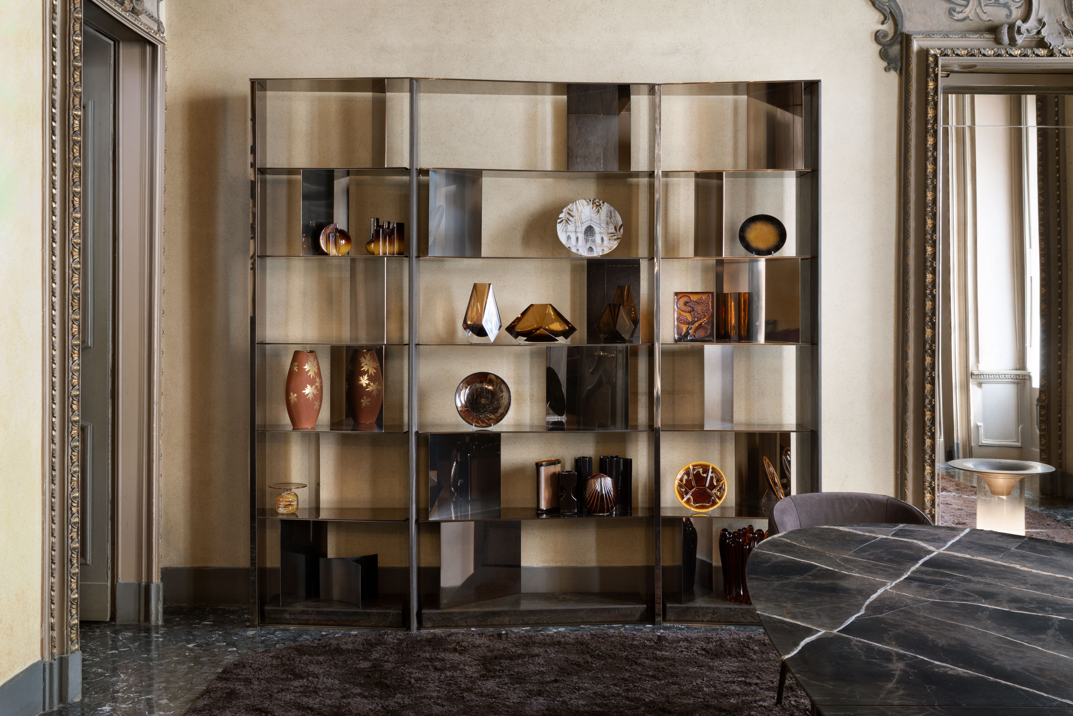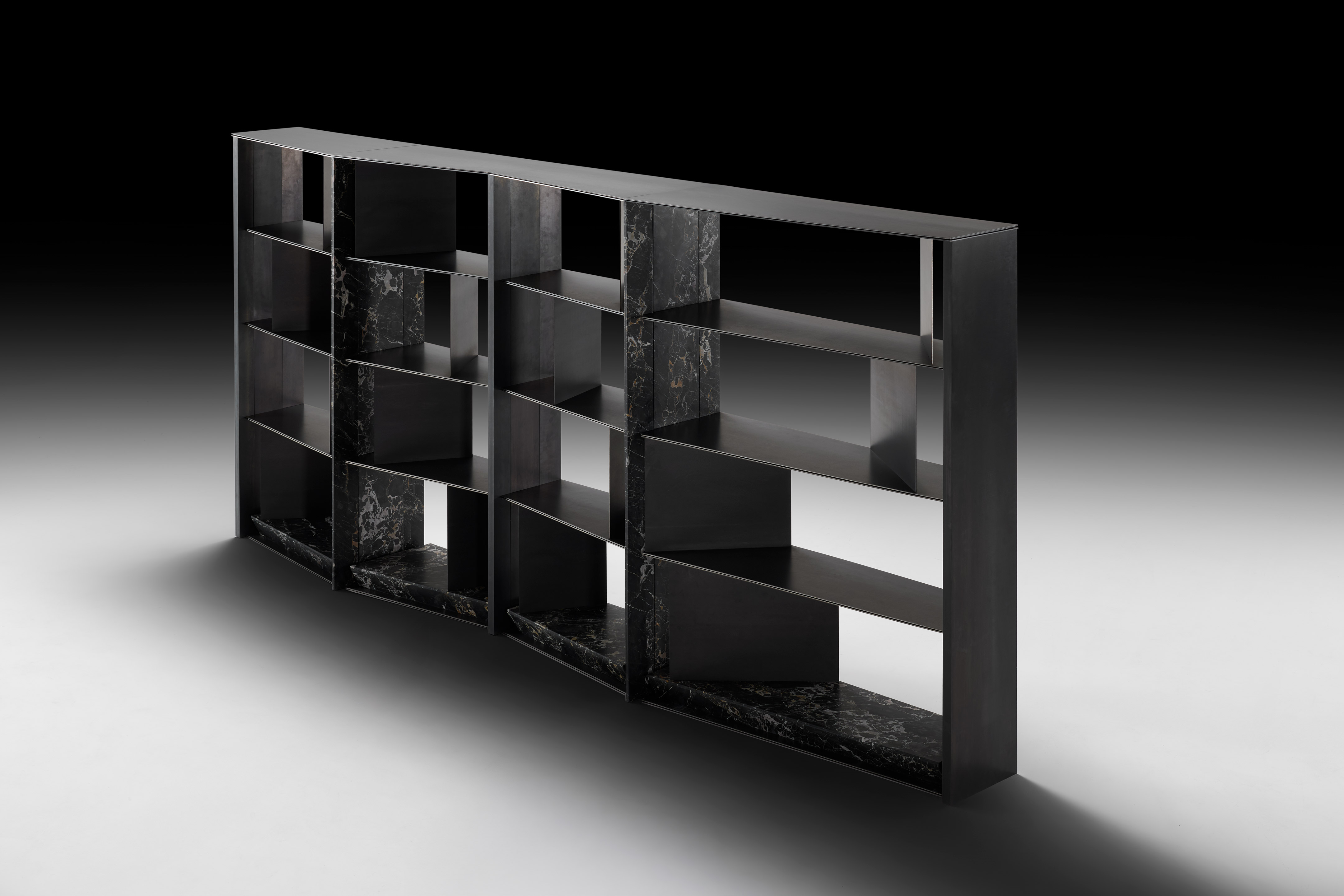 The uprights alternate in a textural score: the gleaming coldness of metal embraces the vibrant veining of marble, while the shelves seem to float, suspended like pages turned by the wind. Each element is designed to welcome light, which slides, refracts, and plays with the surfaces, offering new chiaroscuro effects and suggestions.