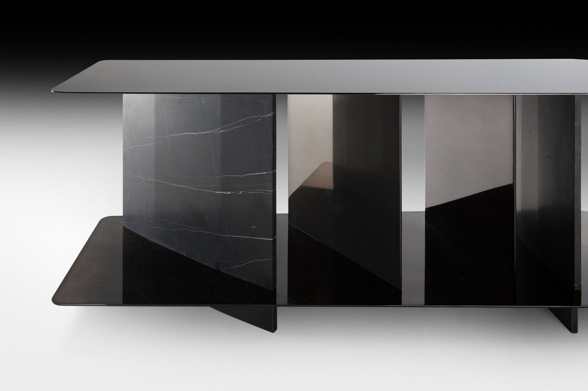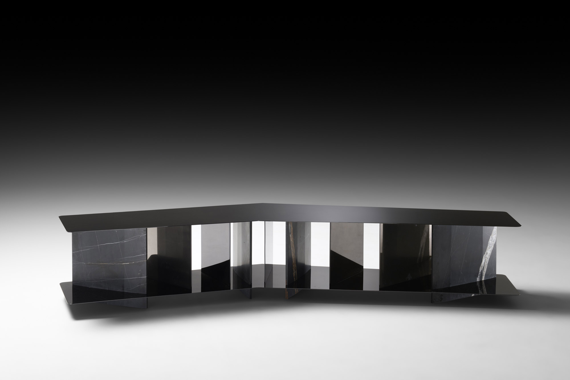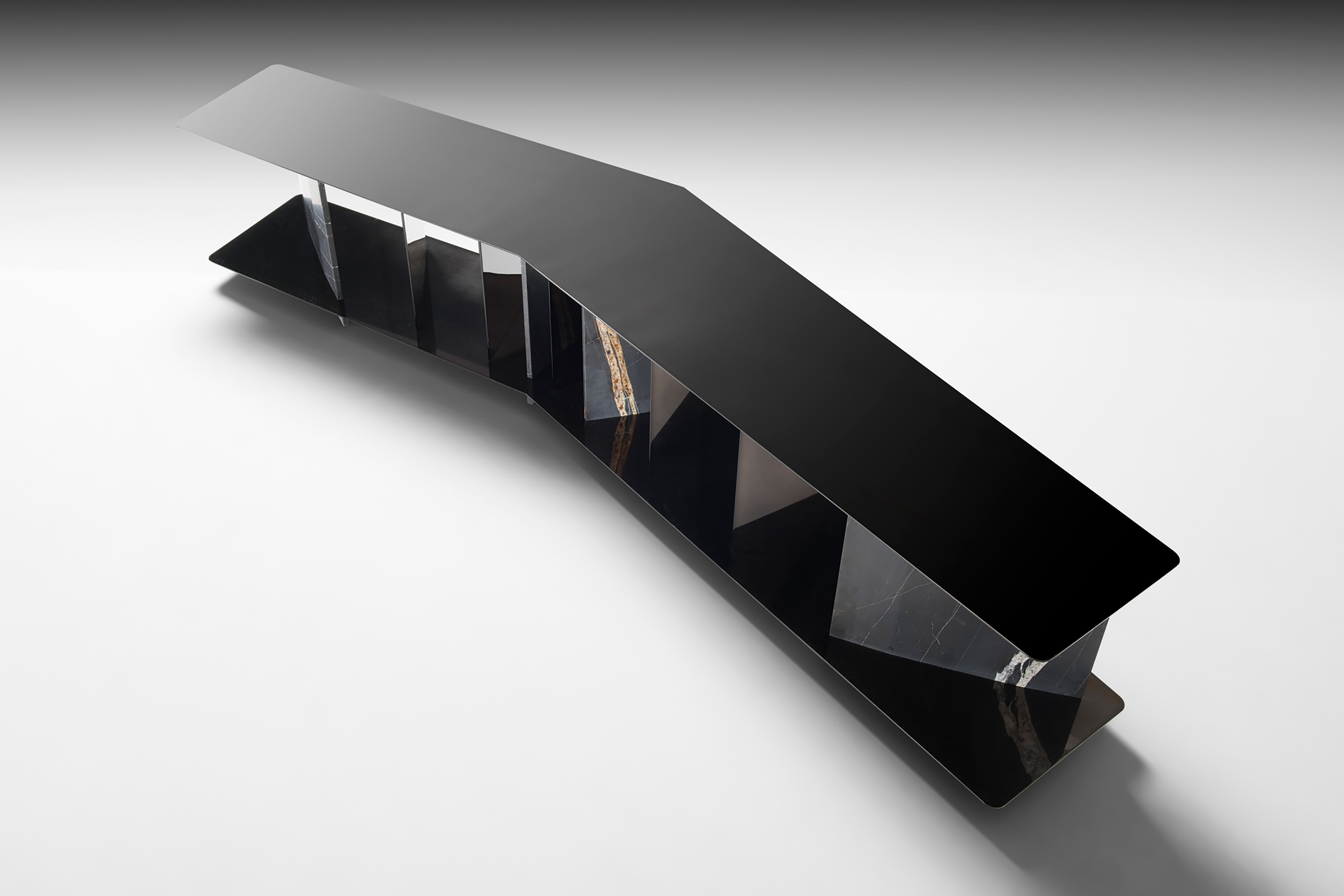 So solid yet so fluid, Piega celebrates the beauty of marble with undeniable lightness. Its identity, composed of reflections and transparencies, creates a visual play that amplifies the perception of fluidity. Its versatility is its strength: it can stand against a wall or freely in the center of the room as a dividing element or an architectural focal point.