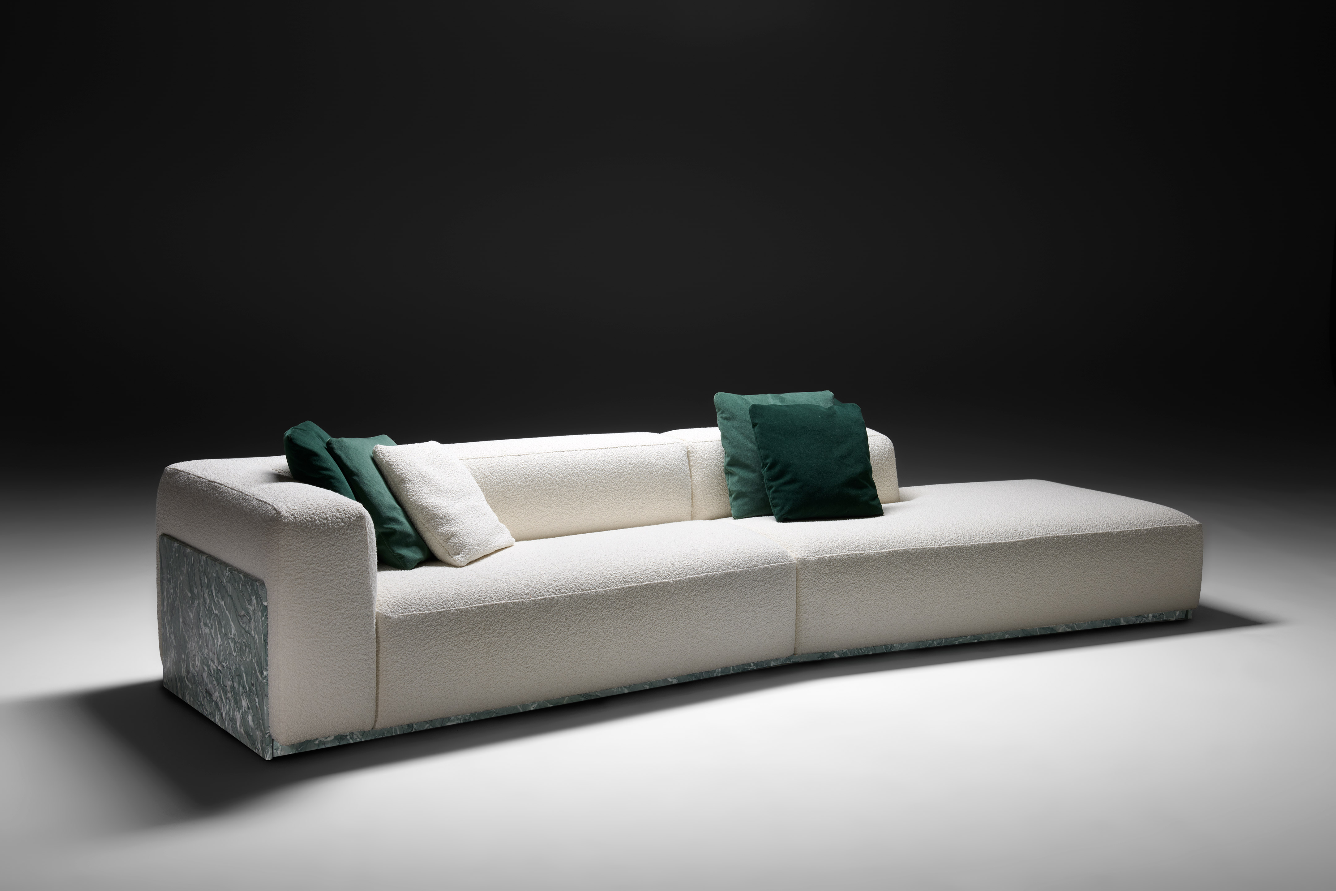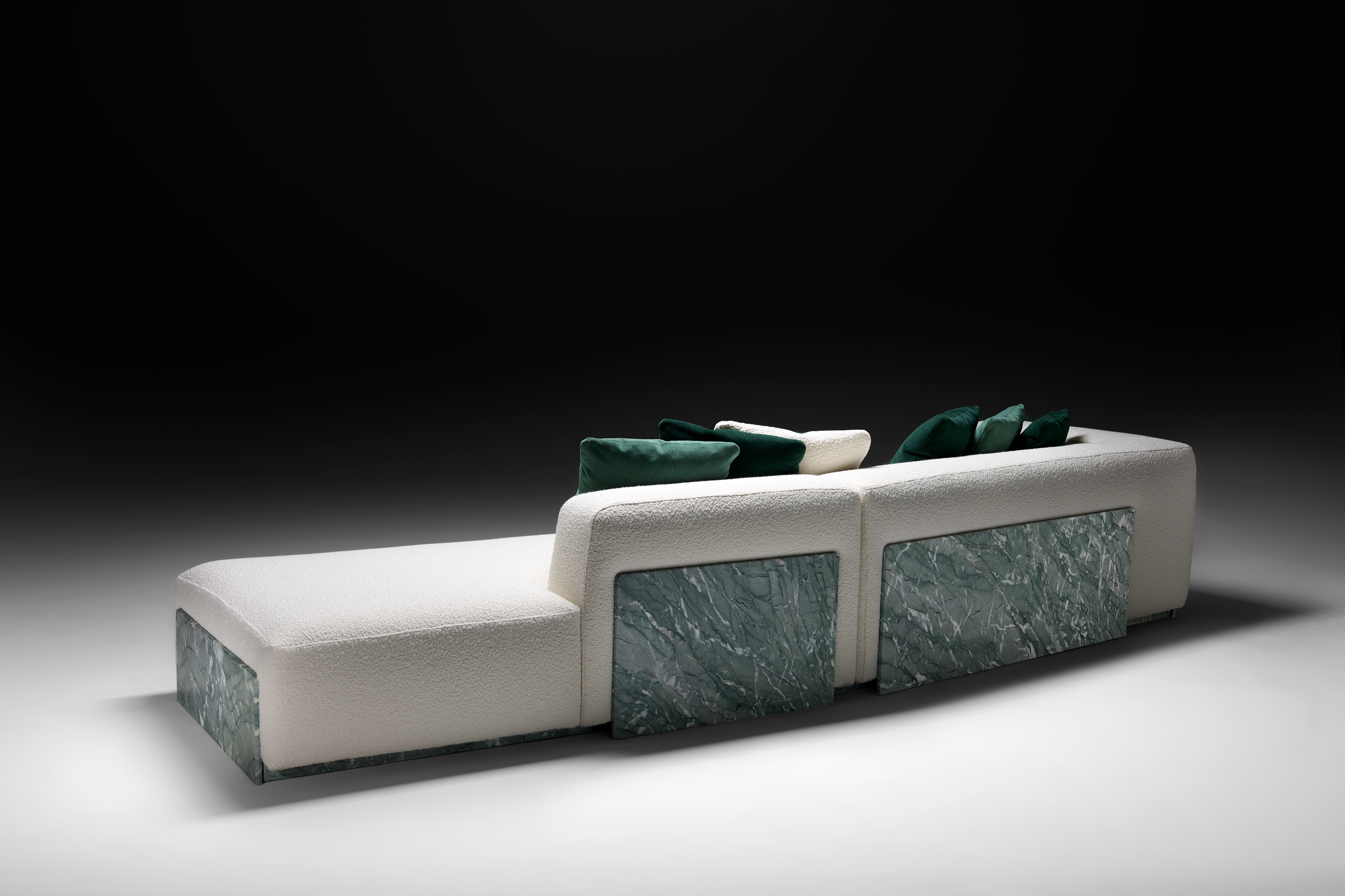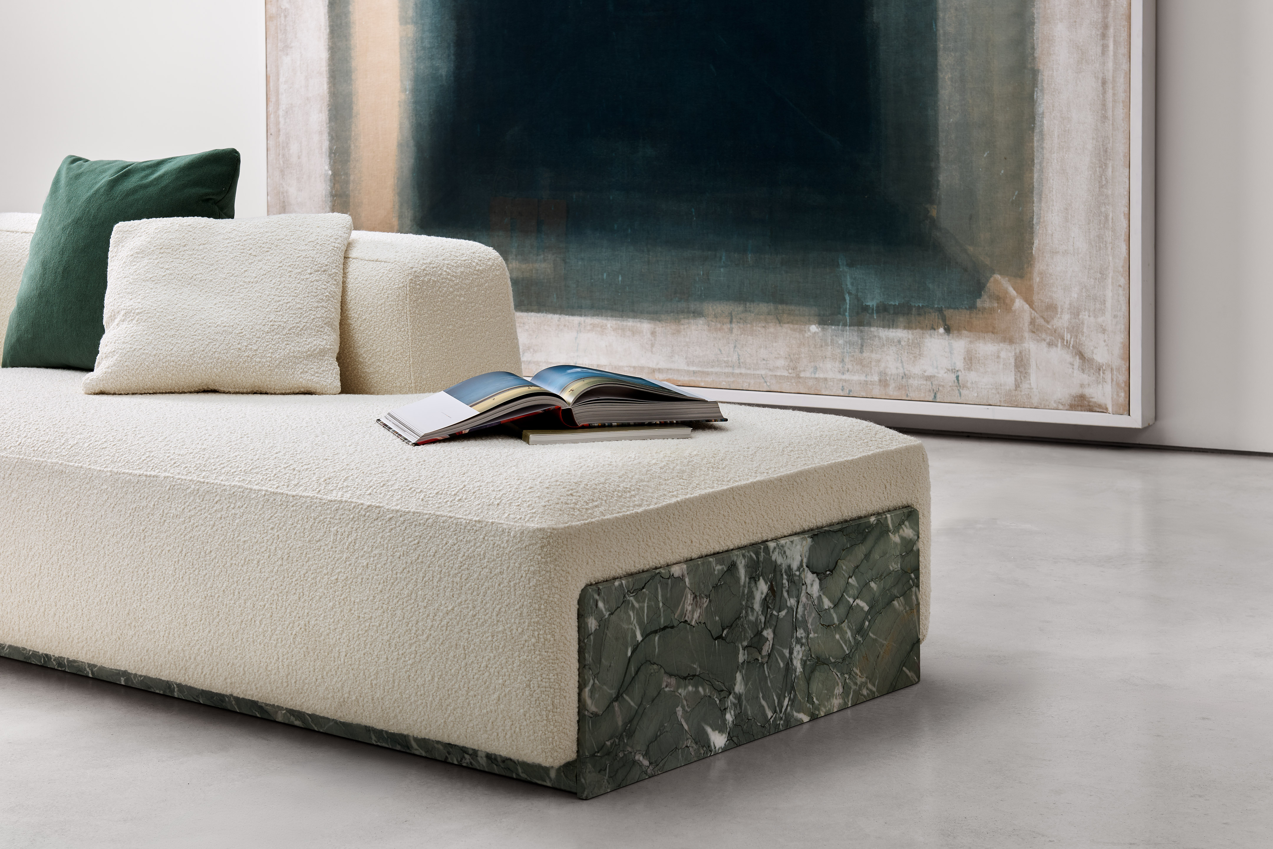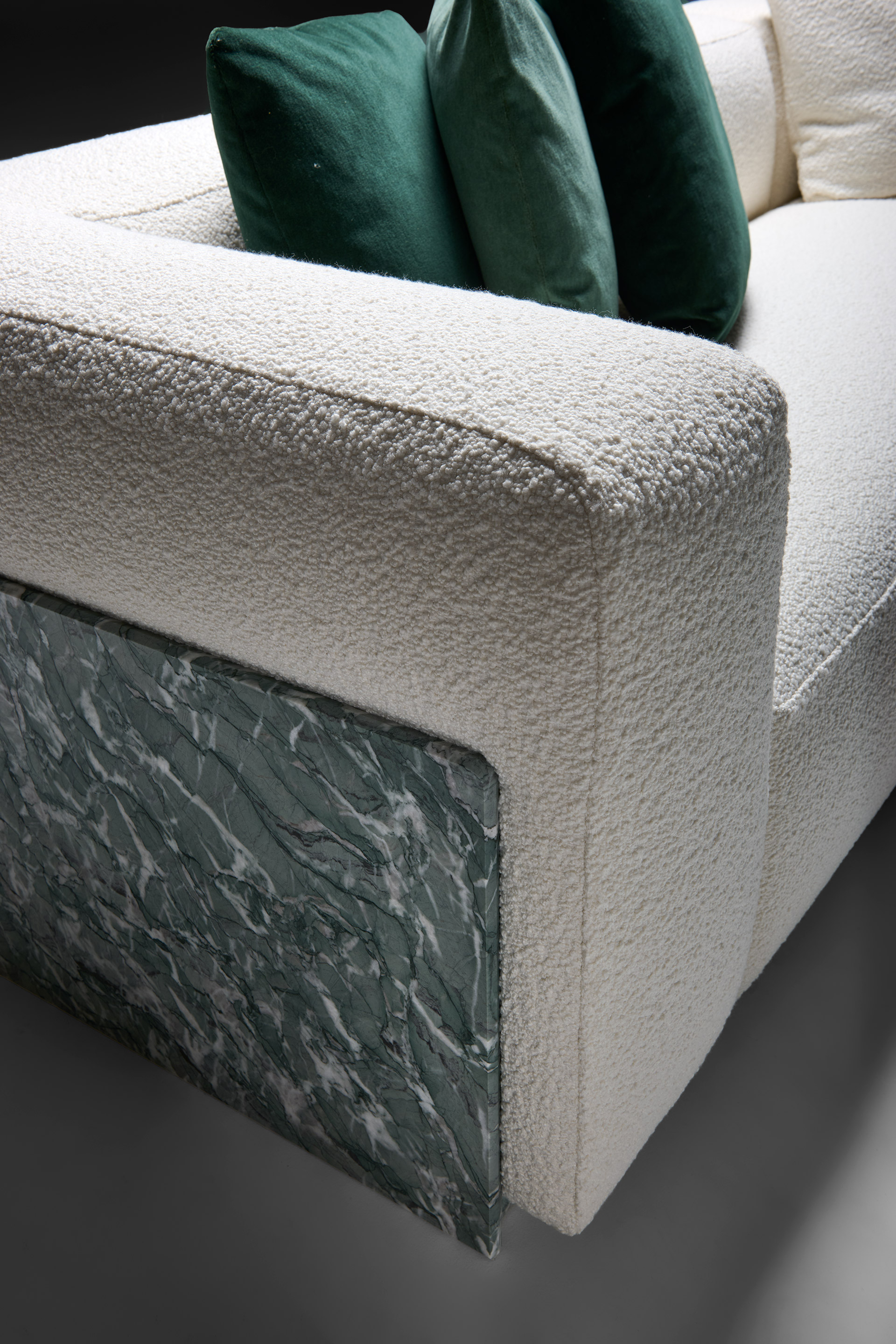 At the heart of the design is a bold contrast: sharp, clean planes of marble form the outer shell, while generous, welcoming cushions provide softness and warmth. The marble elements frame and embrace the upholstery, highlighting its luxurious tactility and creating a harmonious play of weight and lightness.