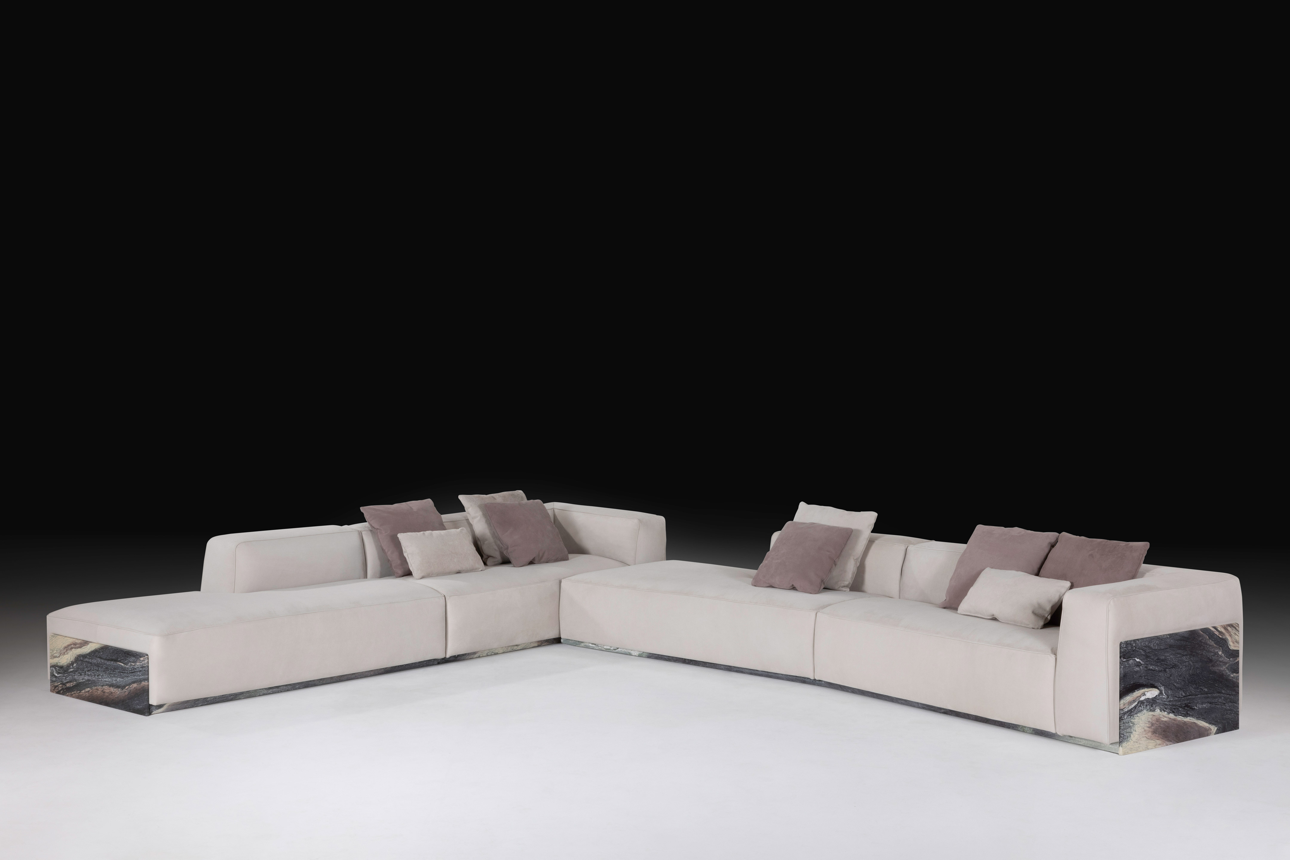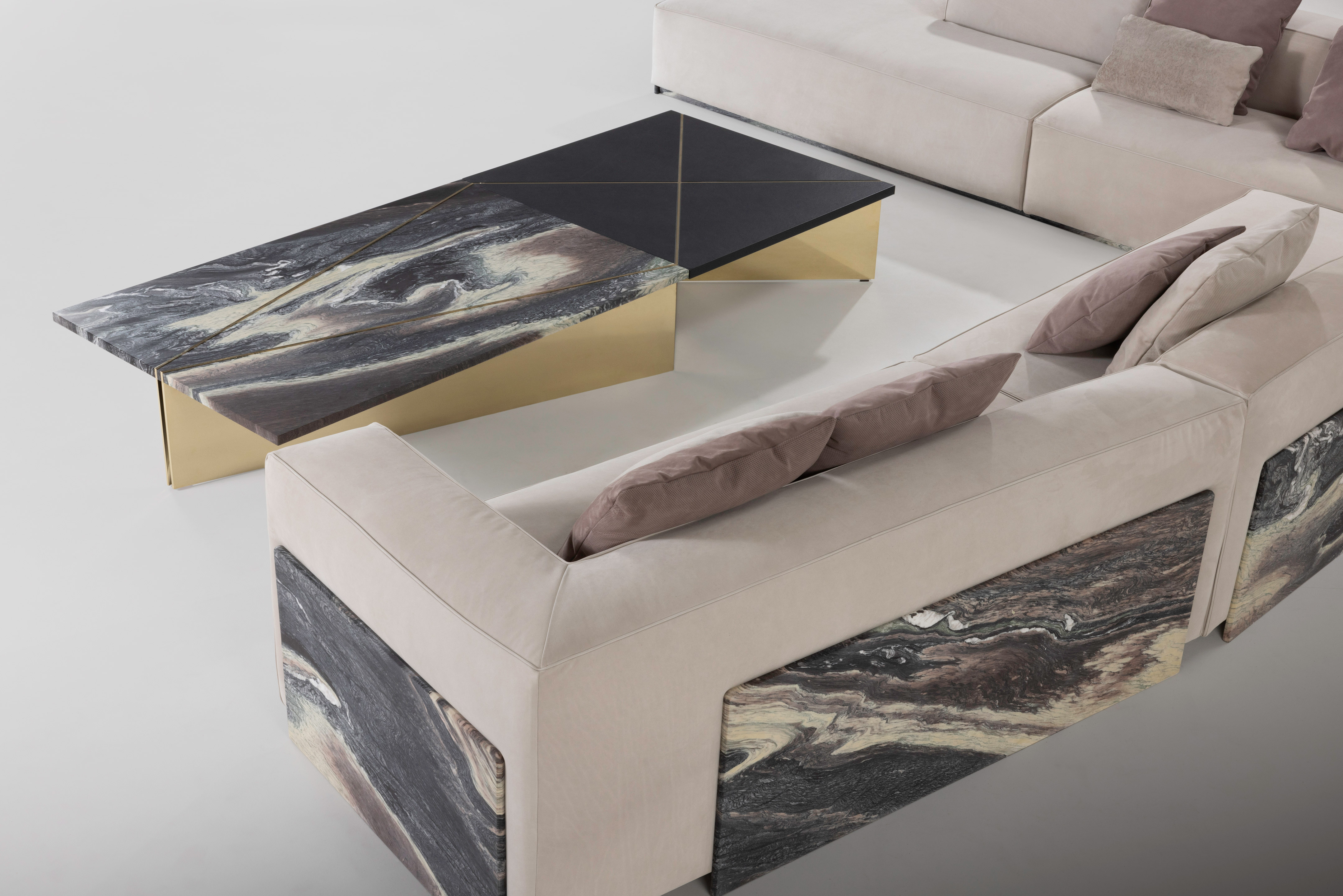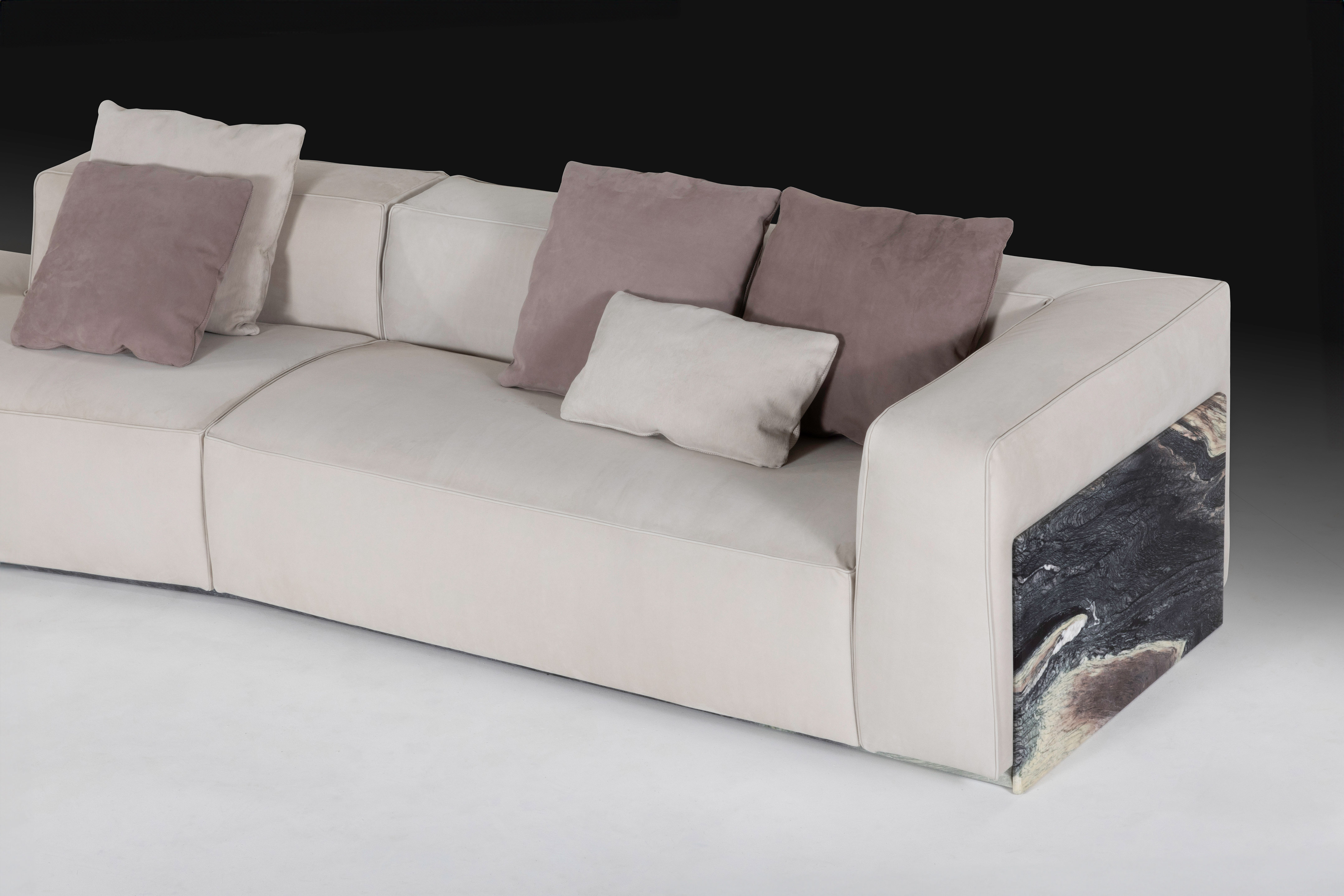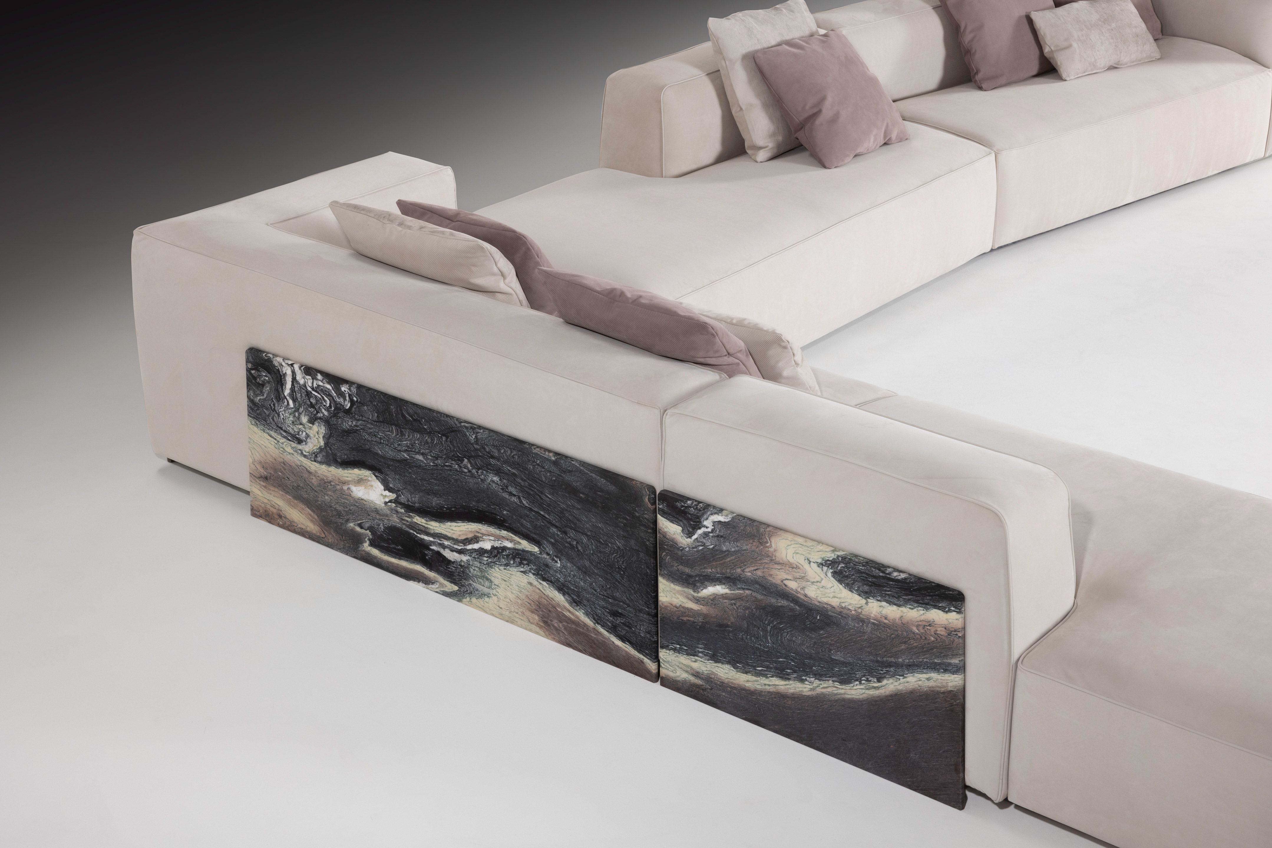 At the heart of the design is a bold contrast: sharp, clean planes of marble form the outer shell, while generous, welcoming cushions provide softness and warmth. The marble elements frame and embrace the upholstery, highlighting its luxurious tactility and creating a harmonious play of weight and lightness.