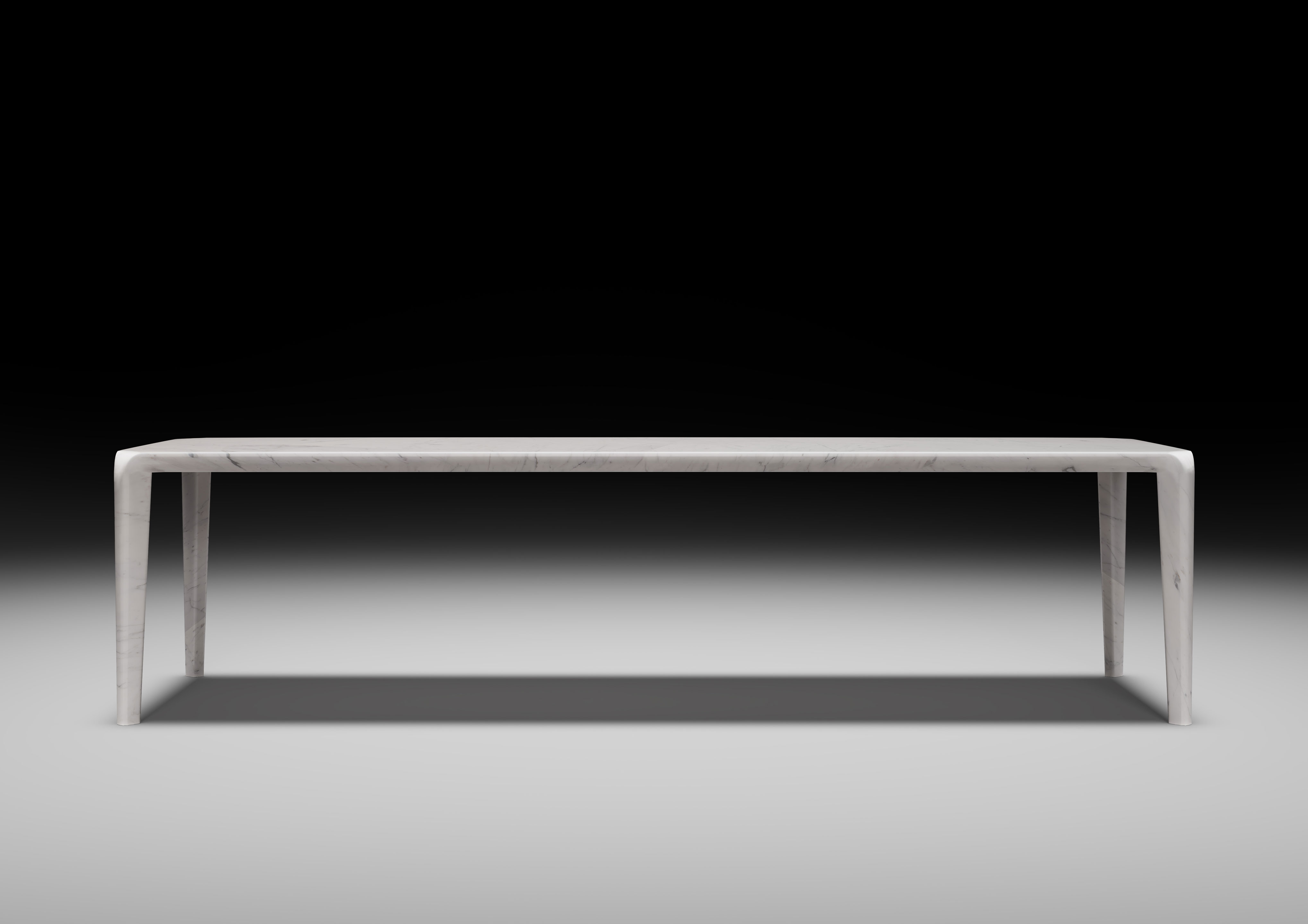 The expansive horizon of the tabletop meets the gentle slope of its edges — a subtle play of geometry and light that culminates in the curving softness of the corners. This harmonious contrast unfolds between the material’s inherent strength and its newly expressive lightness, giving rise to an object that stirs the senses as much as it furnishes the space.