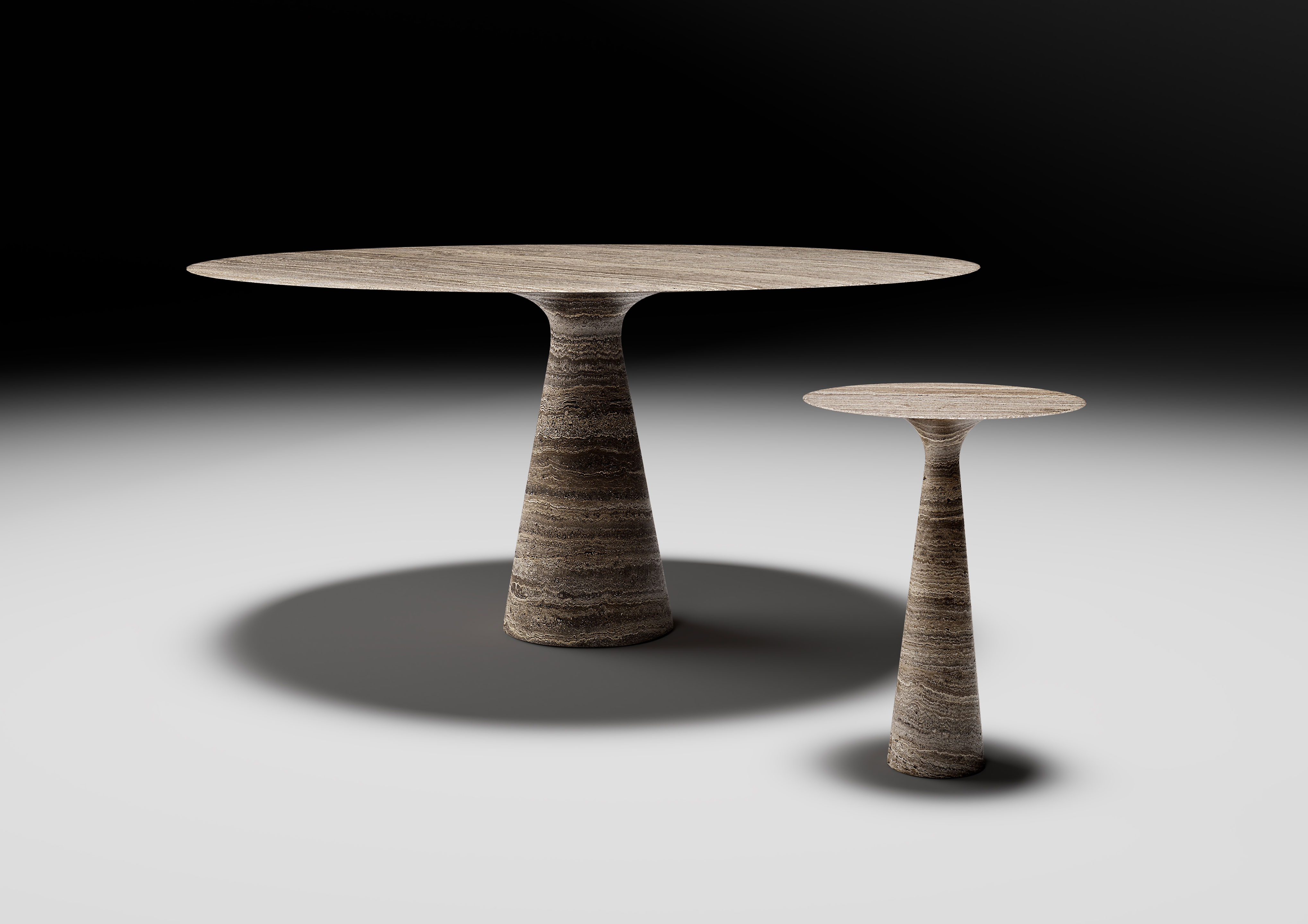 An organic, fluid form masterfully sculpted from natural stone, it stands as a symbol of nature itself—inviting connection and conviviality. The design embodies a sophisticated balance: between the solidity and lightness of the material, between the stability of its grounded base and the airy elegance of its slender top.