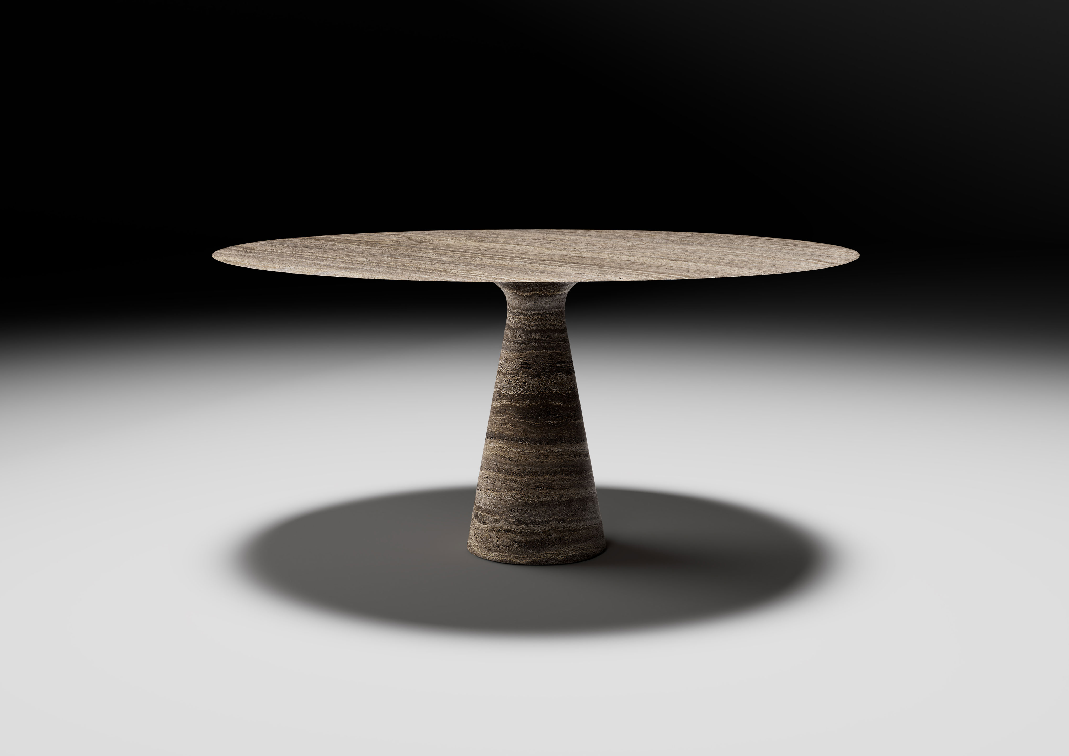 Its surface echoes the passage of time, telling the story of a millennia-old material reinterpreted through a contemporary lens to suit the way we live and experience outdoor spaces today. As natural light shifts throughout the day, it dances across the stone tabletop, subtly altering its appearance with the changing hours.